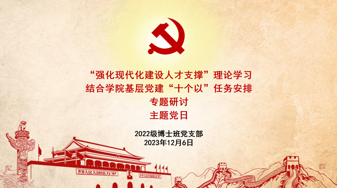 为深入学习贯彻习近平新时代中国特色社会主义思想和党的二十大精神,深刻领会党的二十大报告中“强化现代化建设人才支撑”重大意义与精髓要义,提高党员思想政治素养、理论学习深度与学术实践水平。12月6日,williamhill官网网站2022级博士班党支部组织开展了“强化现代化建设人才支撑理论学习公司基层党建‘十个以’任务安排”主题党日活动,活动分两阶段进行。公司党委书记唐鑛作为2022级博士班党支部理论导师参加了本次活动。