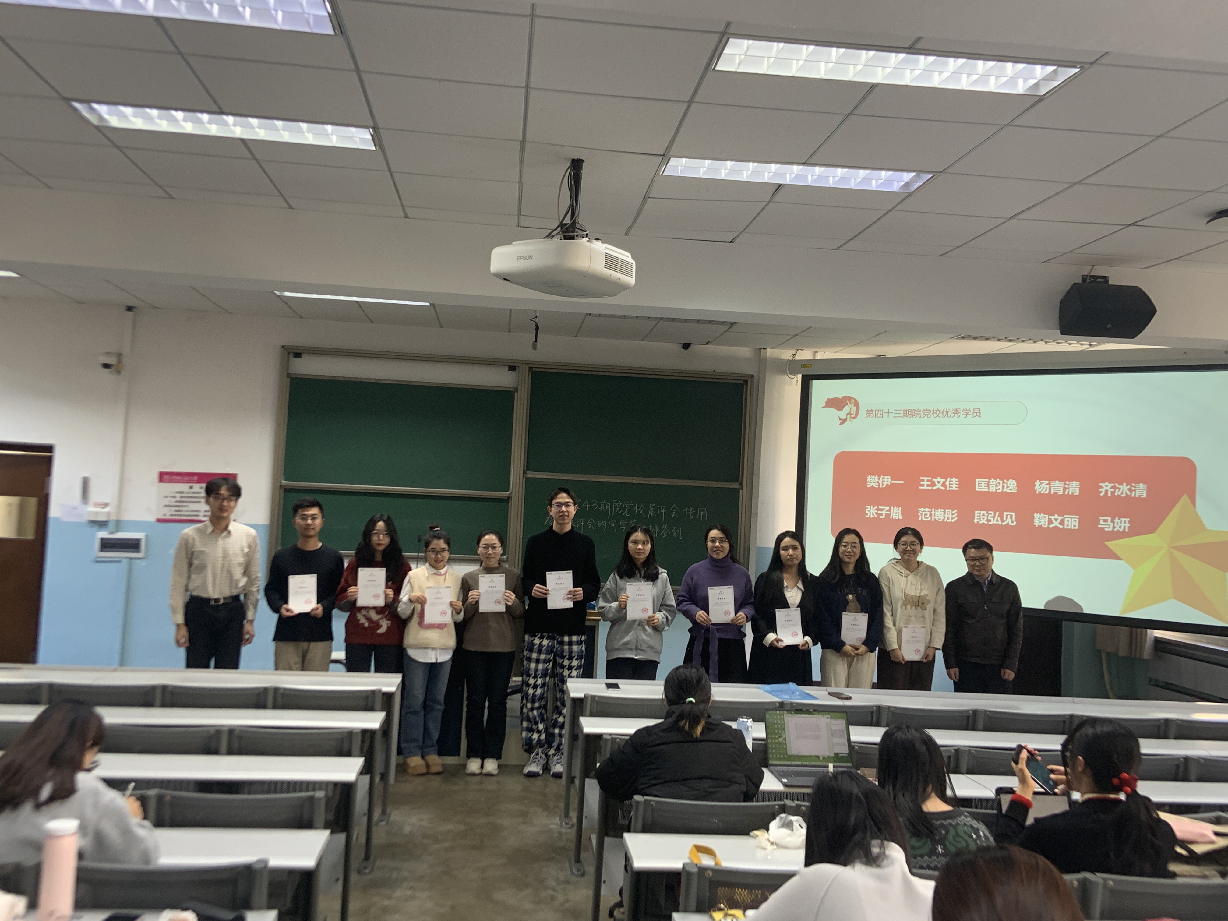 本次公司党校选出优秀学员10人:樊伊一、王文佳、匡韵逸、杨青清、齐冰清、张子胤、范博彤、段弘见、鞠文丽、马妍。