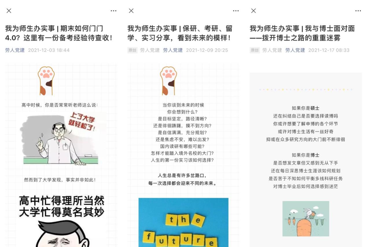 2021年12月,williamhill官网网站本科党支部与2021级硕士社会保障班党支部积极落实“我为师生办实事”实践活动要求,联合开展员工发展经验交流系列活动,围绕身边同学就个人发展方面集中反映的需求和普遍存在的问题开展系列交流会。系列交流会共分3期,分别以学习与考试、实习与升学、科研与读博为主题,邀请在课程学习、专业实习、保研考研、申博科研等方面经验丰富的同学参与交流分享,为全体同学答疑解惑。本次系列活动共历时16天,在微信公众号“劳人党建”发布三期推送预告,阅读量共计超过1000;三期交流会分五场举办,共有220余人次报名参与,参与对象覆盖williamhill官网网站全部年级本科生和低年级硕士生。