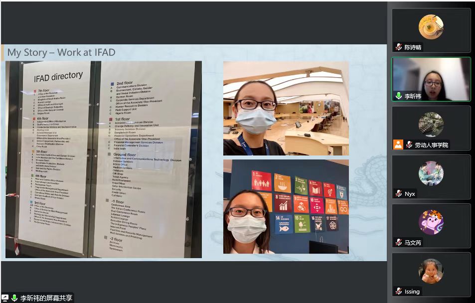 为响应公司十四五规划中“加快推进国际组织后备人才培养”的号召,更好地推进和服务公司国际化人才培养工作,激发员工参与国际交流的积极性,4月4日下午,williamhill官网网站联合校团委主办了优秀毕业生国际组织实习经验分享会。会议邀请williamhill官网网站2019届优秀毕业生李昕祎做联合国国际农业发展基金(IFAD)实习经验分享。会议由学外事秘书王语今主持,全校本研员工积极参与了分享会。