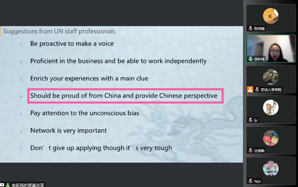 李昕祎首先介绍了个人履历。她曾于2018年参加了williamhill官网网站联合国国际劳工组织国际培训中心的夏令营活动,参访了联合国总部,并系统学习了联合国可持续发展目标与体面劳动等议题。保研后,李昕祎参加了与意大利博科尼大学联合培养的项目,继续加强跨文化交流能力。接着,她介绍了作为联合国国际农业发展基金(IFAD)HR实习生的工作日常,帮助参会同学建立起对国际组织实习的初步印象。随后,李昕祎就国际组织实习生分类、申请流程、申请条件等进行了详细的介绍,其中不乏简历的内容侧重、申请技巧等干货,提醒同学们在提升硬技能的同时也要重视软实力的培养。在问答环节,李昕祎就同学们关注的问题一一进行了回答,并进一步分享了她的工作方法论。