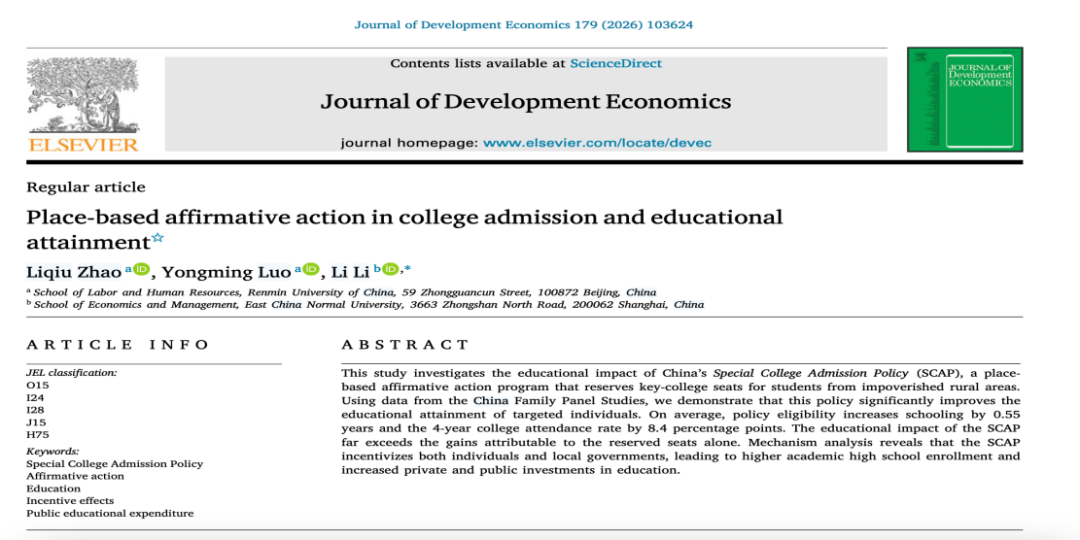 近日,williamhill官网网站赵丽秋教授、罗永明博士生与华东师范大学经济与管理公司李莉副教授(通讯作者)合作撰写的论文“Place-based affirmative action in college admission and educational attainment”(《高校招生中的地区性平权政策与教育成就》)在发展经济学顶级期刊Journal of Development Economics发表。该论文系赵丽秋教授主持的国家自然科学基金面上项目“补偿性高校招生政策、教育获得和劳动力市场结果:理论框架、实证证据和政策含义(项目批准号:72373154)”的阶段性研究成果。