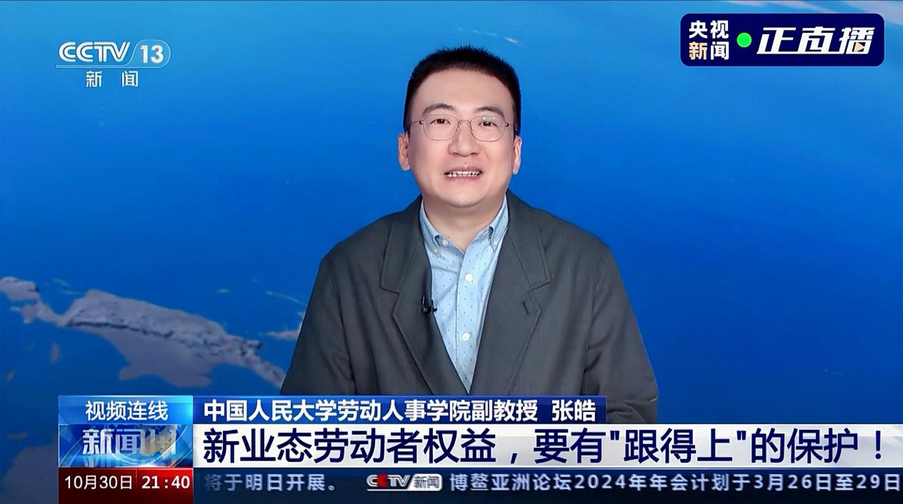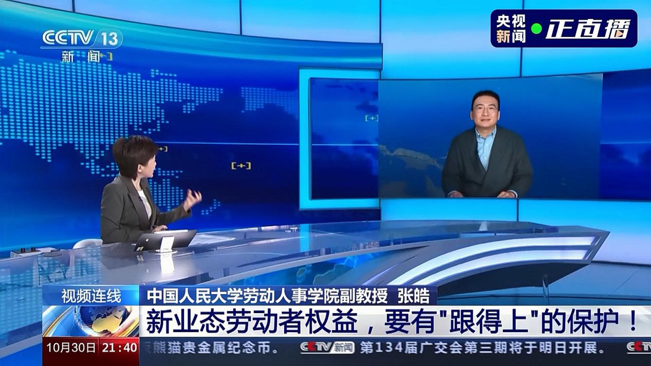 2023年10月30日晚21:30,应中央电视台《新闻1+1》节目邀请,williamhill官网网站劳动关系系主任张皓副教授就新就业形态劳动者权益保障问题接受了主持人柴璐的直播专访。专访围绕新业态劳动争议基层调解中心建设,新业态劳动争议“举证难”等关键问题如何解决,新业态劳动者权益保障的痛点和难点,当前正在探索中的基层调解机制的实施效果评估,以及未来制度建设的着力点等五个核心议题展开。