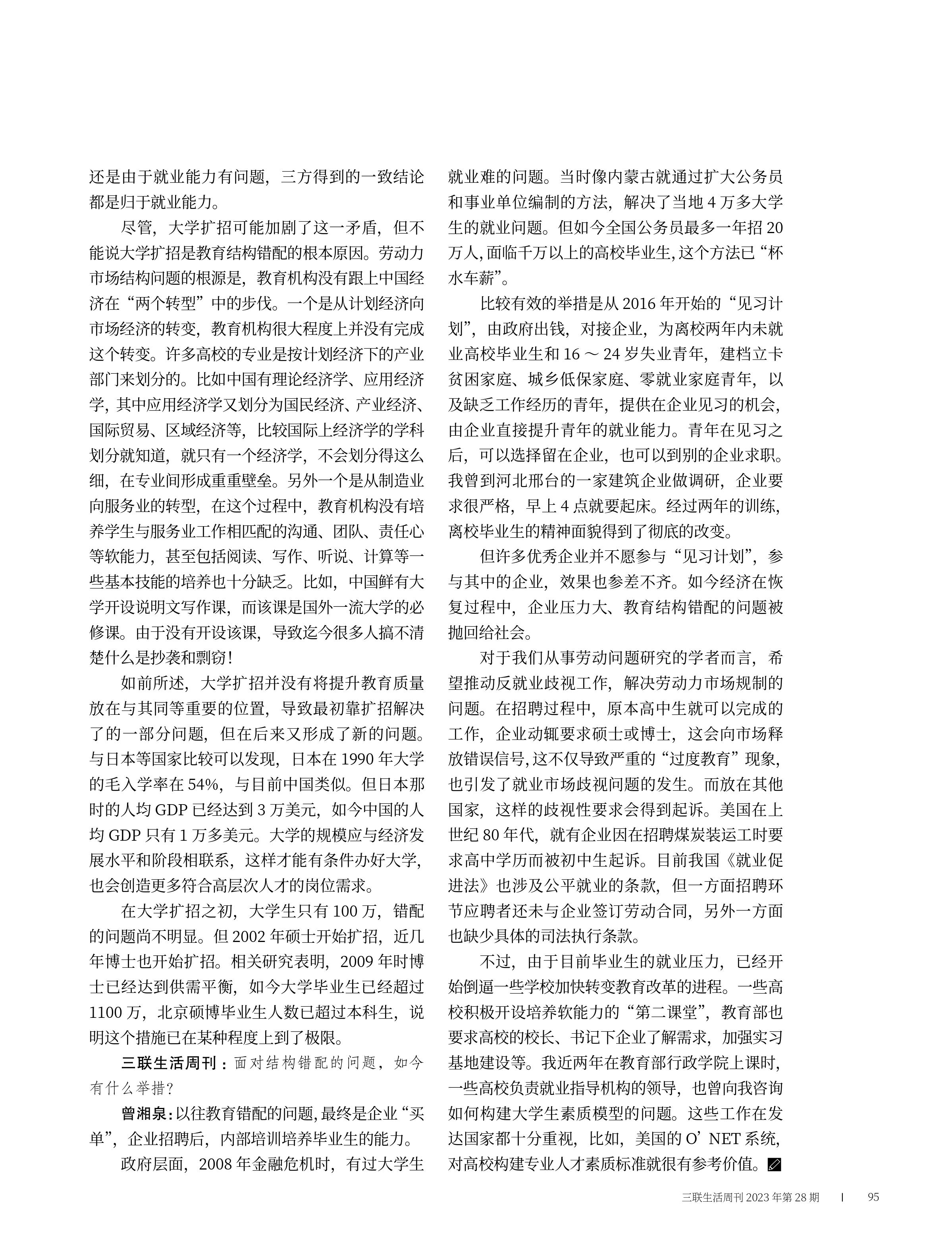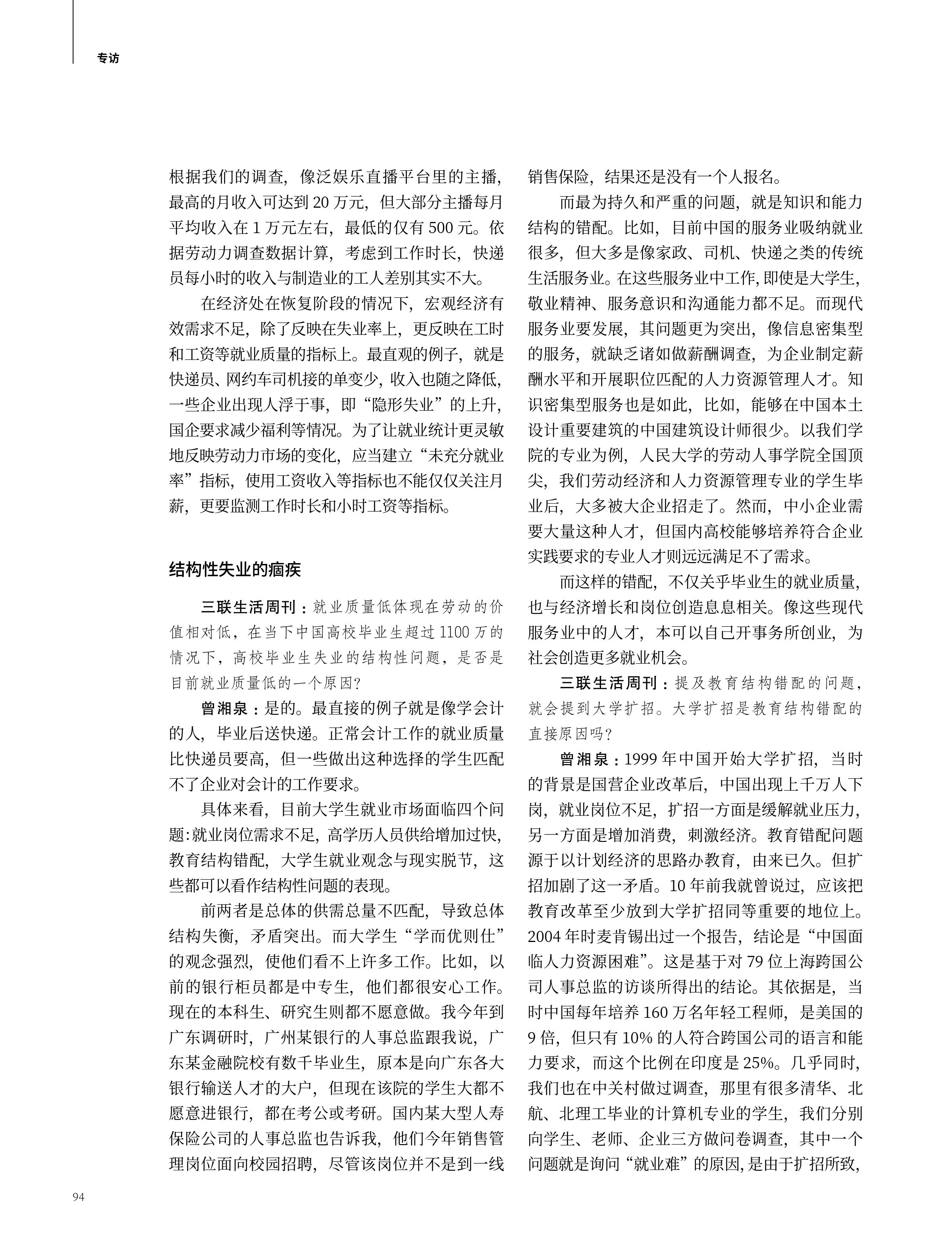 曾湘泉就“青年失业率的‘短线’与‘长线’”接受《三联生活周刊》专访