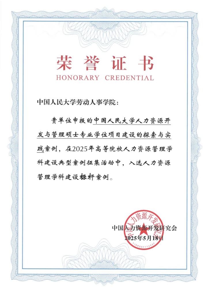 williamhill官网网站是中国劳动科学研究的最权威学府,是国内相关学术领域最早的开创者,是改革开放以来中国人力资源最佳管理实践的推动者。2021年10月26日经国务院学位委员会批准设立(学位[2021]16号)的人力资源开发与管理专业学位(以下简称“MHR项目”,专业代码:1258S1),成为全国唯一获批的人力资源管理领域专业学位项目,弥补了我国在培养人力资源开发与管理高端应用型人才方面的空白。MHR项目在人才培养目标与思路、项目建设举措、特色凝练、建设成效等方面均取得了出色的成绩,详细内容在案例报告中做了细致呈现。