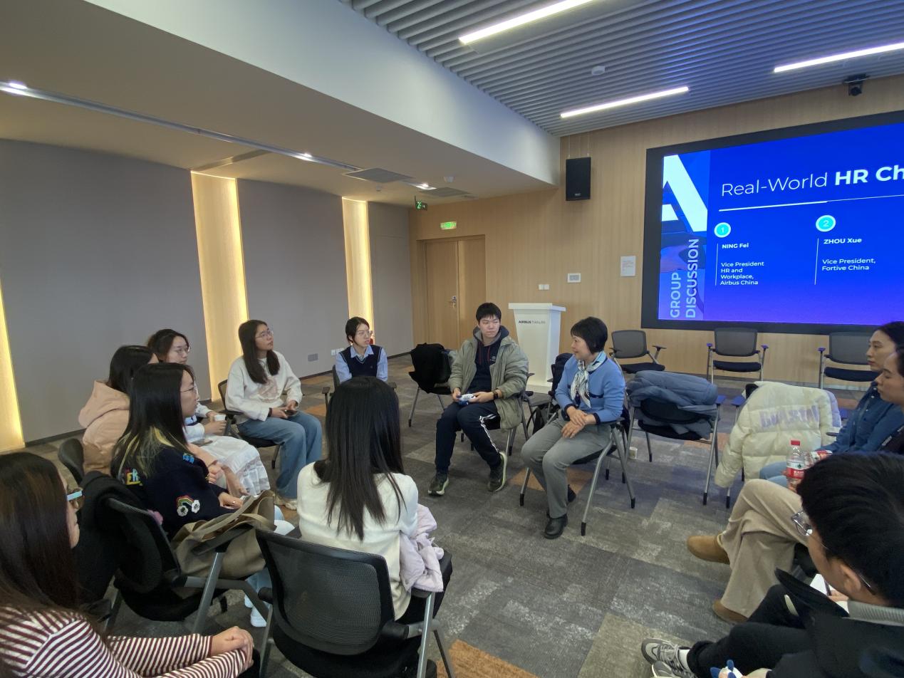 在互动小组研讨环节,同学们分为三个小组,分别由三位企业人力资源负责人带领,围绕“当前人力资源实践中的挑战与应对”展开深入讨论。子议题覆盖远程办公政策设计、员工留存策略、人工智能在招聘中的应用、职场心理健康支持等现实问题,并特别结合航空等高端制造行业的实际情况进行探讨。