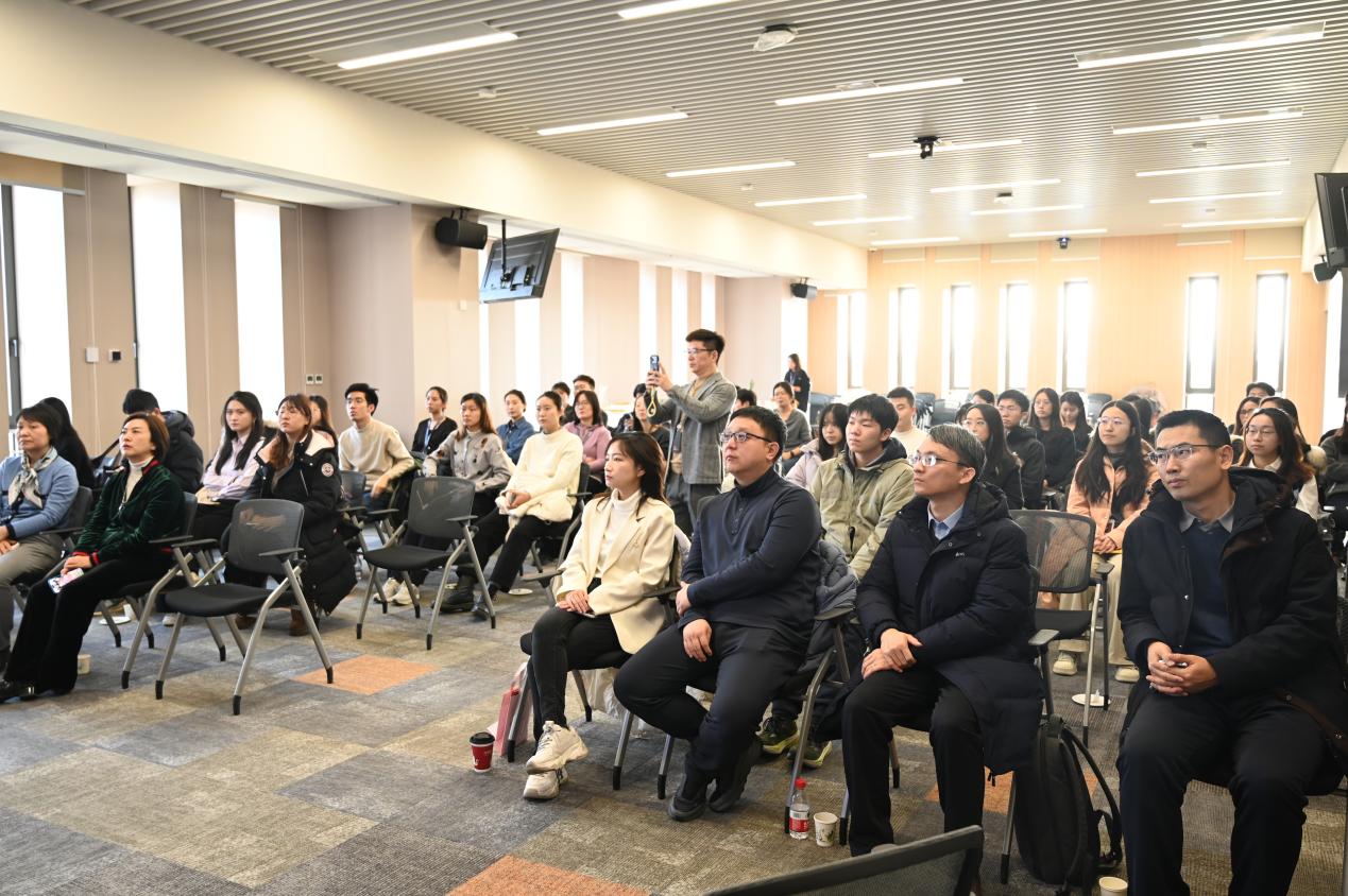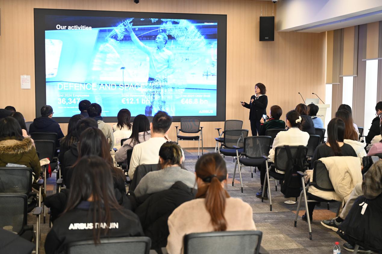 参访伊始,空中客车中国人力资源及工作场所副总裁、公司专业学位硕士研究生校外实践导师宁斐以“空客核心基因与人力资源实践”为主题,为师生们系统解读了企业的发展脉络与管理理念,并重点解读了公司在人力资源管理方面的创新实践。宁斐副总裁详细介绍了空客以“互敬互责”为核心的“I系列”文化理念,强调企业始终将“人”视为所有生产力的中心,致力于推动国际化视野与本土文化的深度融合。面对人工智能的发展趋势,她分享道,空客秉持“AI辅助人类而非替代人类”的原则,在招聘等人力资源环节中合理运用技术工具,同时始终坚守人文关怀的本质。在跨文化管理方面,依托企业源于法、德、英、西四国的多元基因,空客将文化包容性深度融入制度设计与日常运营,并通过国际化项目与人才流动机制,积极构建真正意义上的全球化团队。