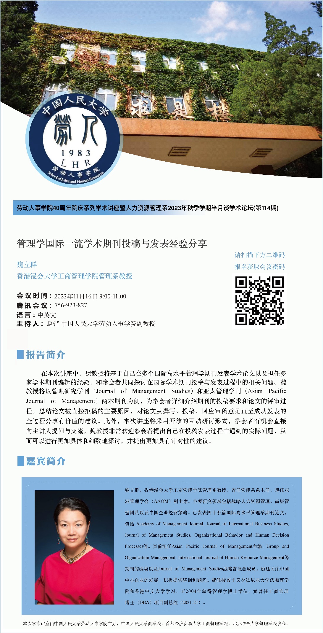 在本次讲座中,魏教授将基于⾃⼰在多个国际⾼⽔平管理学期刊发表学术论⽂以及担任多家学术期刊编辑的经验,和参会者共同探讨在国际学术期刊投稿与发表过程中的相关问题。魏教授将以管理研究学刊(Journal of Management Studies)和亚太管理学刊(Asian Pacific Journal of Management)两本期刊为例,为参会者详细介绍期刊的投稿要求和论⽂的评审过程,总结论⽂被直接拒稿的主要原因,对论⽂从撰写、投稿、回应审稿意见直⾄成功发表的全过程分享有价值的建议。此外,本次讲座将采⽤开放的互动研讨形式,参会者有机会直接向主讲⼈提问与交流,魏教授⾮常欢迎参会者提出⾃⼰在投稿发表过程中遇到的实际问题,从⽽可以进⾏更加具体和细致地探讨,并提出更加具有针对性的建议。