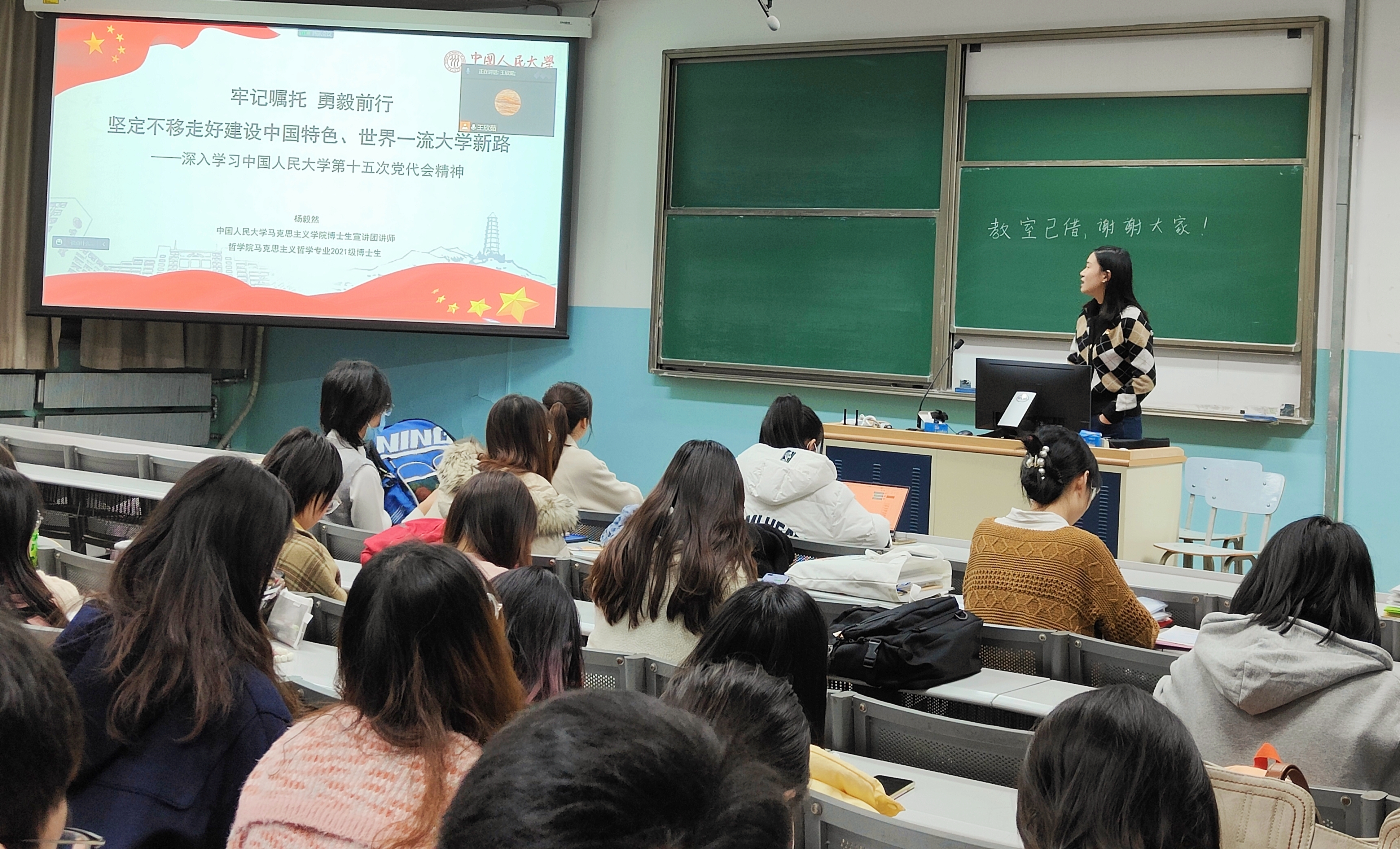 会议结尾,王欣茹指出我国已开启全面建设社会主义现代化国家新征程。蓝图已经绘就,号角已经吹响。作为与祖国同呼吸共命运的青年人,我们要积极响应时代的召唤,在新的历史起点找到自己的定位,要把对祖国血浓于水、与人民同呼吸共命运的情感贯穿学业全过程、融汇在事业追求中。