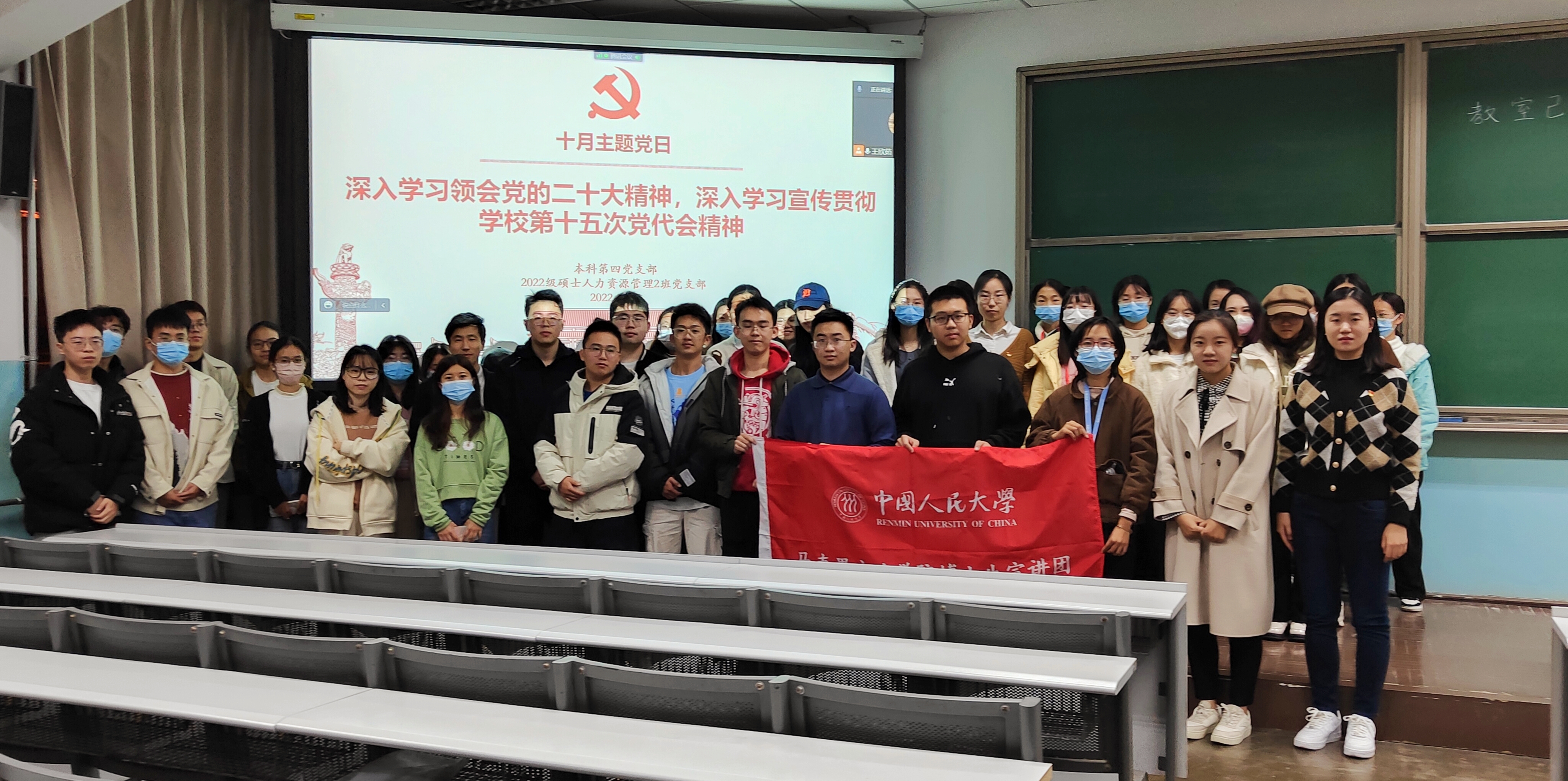 2022年10月27日晚,williamhill官网网站本科第四党支部与2022级硕士人力资源管理2班党支部在求是楼0120教室联合开展“深入学习领会党的二十大精神,深入学习宣传贯彻公司第十五次党代会精神”主题党日活动。活动由本科第四党支部副书记王欣茹和2022级硕士人力资源管理2班党支部书记彭格格共同主持,支部全体党员和若干积极分子参加活动并分享学习感悟。