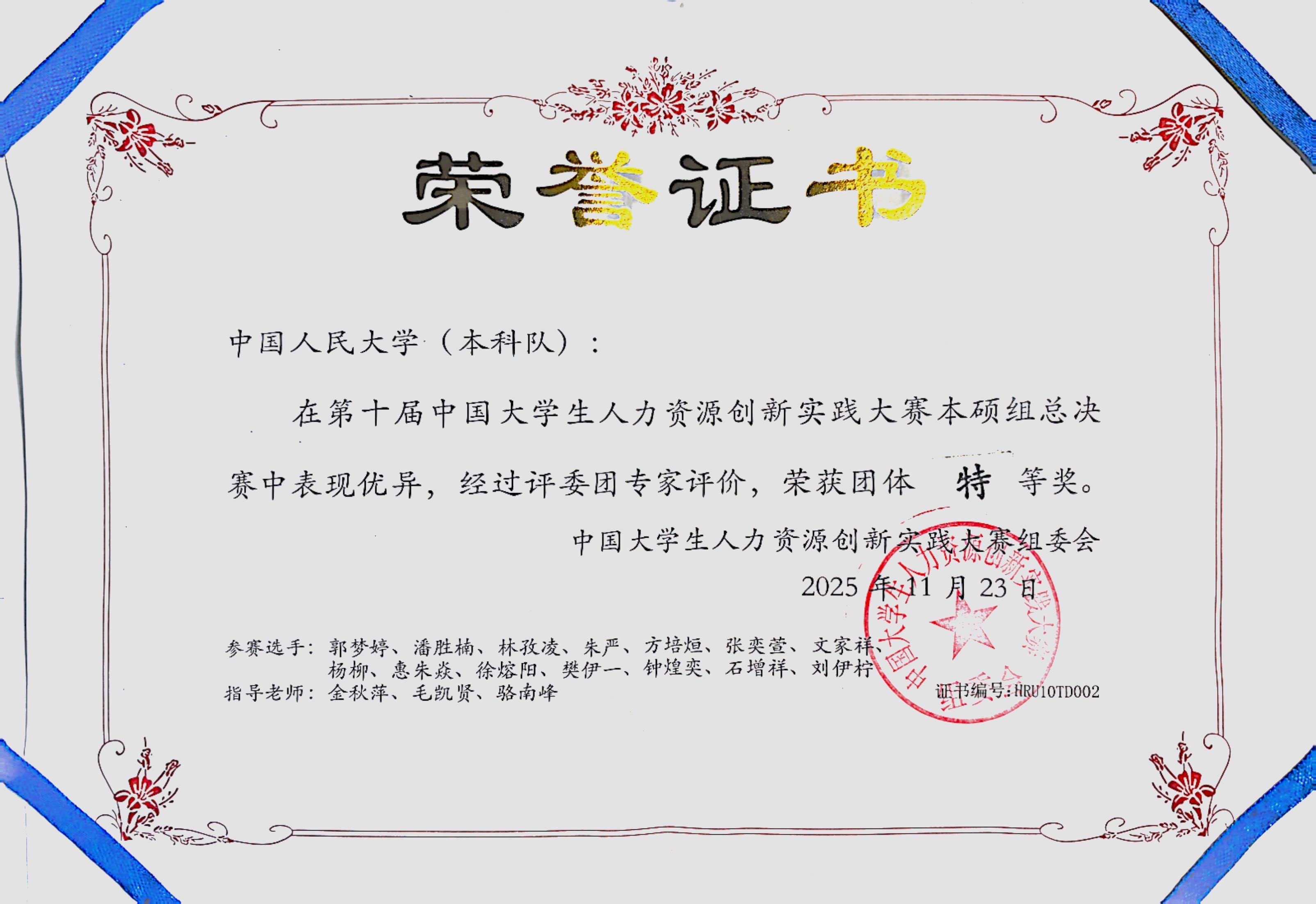 很荣幸能在HRU的赛场上与优秀的同学们并肩,一同展现人大学子的风采。这份荣誉源于公司的栽培、师长的支持、朋辈的互助,更属于我们每一个人!