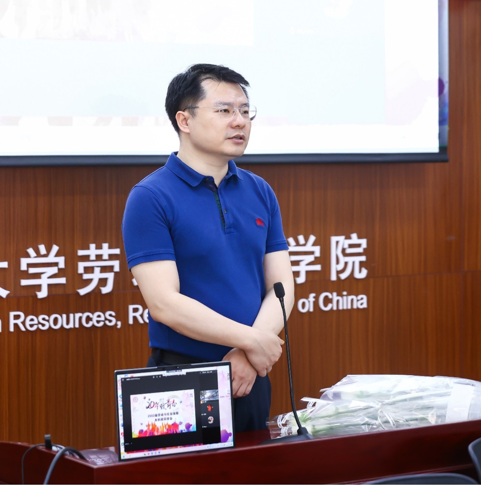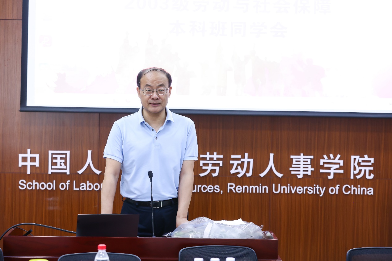 茶话会上,班级同学向班主任杨伟国老师表达了深深的感谢。作为班主任,杨老师在同学们求学期间和毕业以后都对大家给予了无私的关爱和帮助。随后,北京市社科院副经理、2003级劳动与社会保障班班主任杨伟国教授发表感言。杨老师首先感谢大家能够抽出宝贵时间重返母院,非常高兴参加今天的活动。见证同学们的成长是老师最大的幸福。2003年既是班级同学的入学年份,也是杨老师的入职年份。2003级劳保班是杨老师当班主任的第一个班。这种缘分也使得杨老师对班级同学给予了更多的关爱和照顾。感谢同学们这么多年的相知相亲,更为大家骄傲自豪!