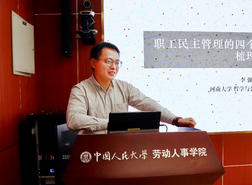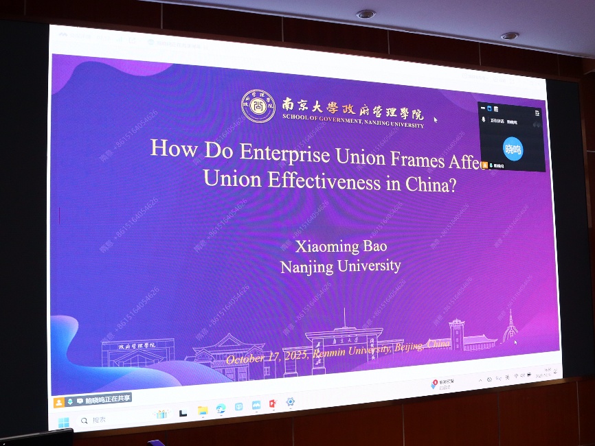南京大学政府管理公司鲍晓鸣研究员线上参会,他聚焦工会话语框架及其对集体协商效果的影响,揭示了企业工会的话语能力对工会效能的重要影响。