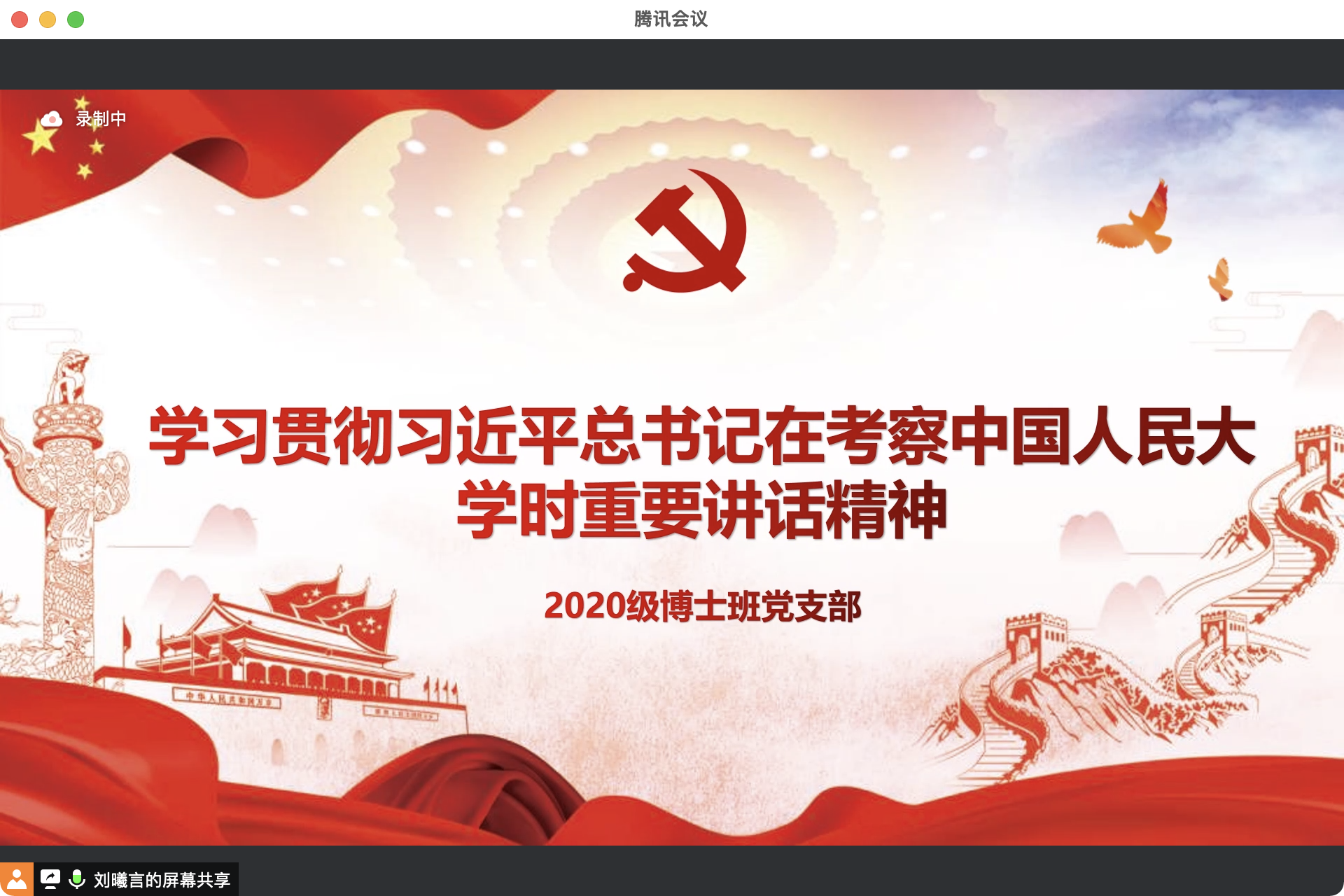 首先,2020级博士班党支部书记刘曦言同志带大家系统回顾了习近平总书记在考察williamhill官网网站时重要讲话精神。学习围绕四个主题展开,依次为“思政课的本质是讲道理”、“继承优良传统,赓续红色血脉”、“必须有世界一流的大师”、“打造中国特色、世界一流的学术资源信息平台”。最后,她带领支部成员重温了总书记对人大学子的殷切期望:希望全国广大青年牢记党的教诲,立志民族复兴,不负韶华,不负时代,不负人民,在青春的赛道上奋力奔跑,争取跑出当代青年的最好成绩!