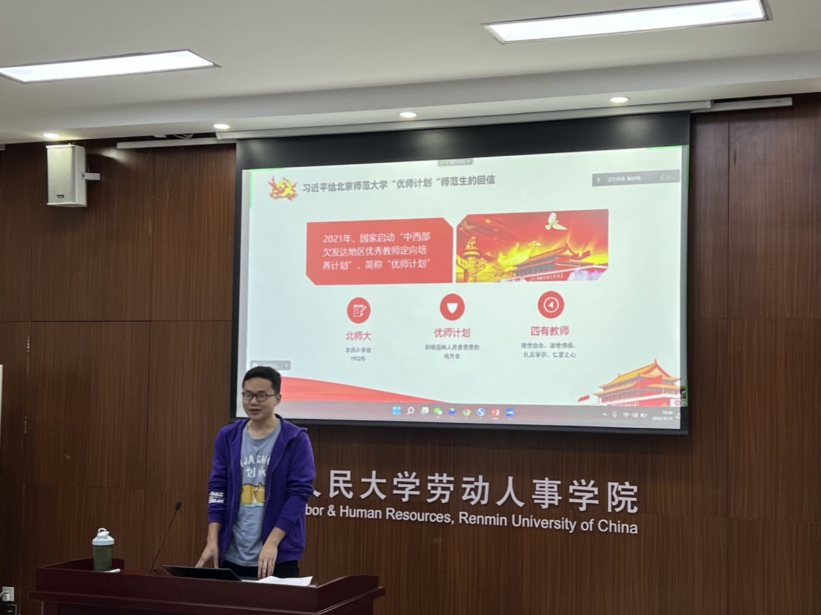 随后,本科来自北京师范大学的支部纪检委员全程同志向大家介绍了北京师范大学“优师计划”,并带领大家阅读了习近平给北京师范大学“优师计划”师范生的回信。信中,习总书记鼓励师范生同学们成为党和人民满意的“四有”好老师,为培养德智体美劳全面发展的社会主义建设者和接班人贡献力量。支部同志深受北师大“学为人师,行为世范”精神以及总书记回信的触动,对到祖国和人民最需要地方去的前辈表示十分敬佩。