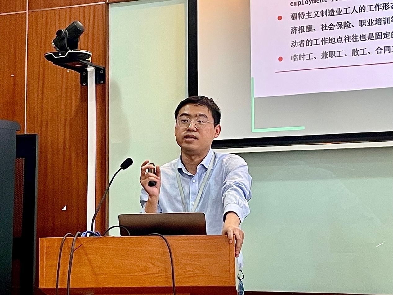 朱斌副教授从选题缘起、研究过程和结论发现等多个方面进行了分享。他表示,从不稳定工作或灵活就业的角度去观察中国劳动力市场十几年来的变化会有两个发现:一是不稳定工作的规模总体下降,二是不稳定工作与稳定工作之间的差异扩大。这与西方劳动力市场的变化及其背后的新自由主义逻辑有着明显区别。因此,需要寻找新的理论视角来解释中国劳动力市场的新变化。结合相关实际,他最终选择从新制度主义视角出发,认为随着国家加强对劳动力市场的干预,雇主所面临的制度环境与技术环境的要求存在一定冲突:新出台的一系列劳动与社会保障相关法律法规使得雇主不得不增加稳定工作,但同时通过降低剩下不稳定工作的经济利益来平衡前者增加的成本,这使得“稳定—不稳定”二元结构的分割程度加强,从而出现了较为矛盾的变化趋势。