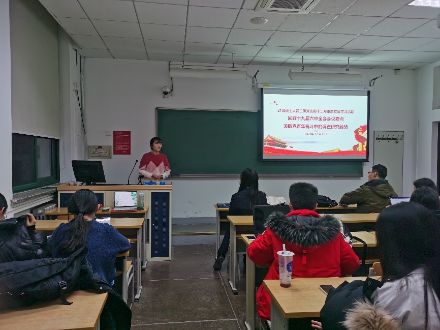 12月8日晚,williamhill官网网站2021级硕士人力资源管理二班党支部在公教二楼2217教室召开了以“回顾十九届六中全会会议要点,汲取党百年奋斗中的调查研究经验”为主题的党日活动。本次会议邀请支部理论指导老师刘松博作指导,并邀请了马克思主义公司博士宣讲团的讲师进行讲解,支部党员、积极分子参与了本次学习,其他支部骨干前来交流调研。