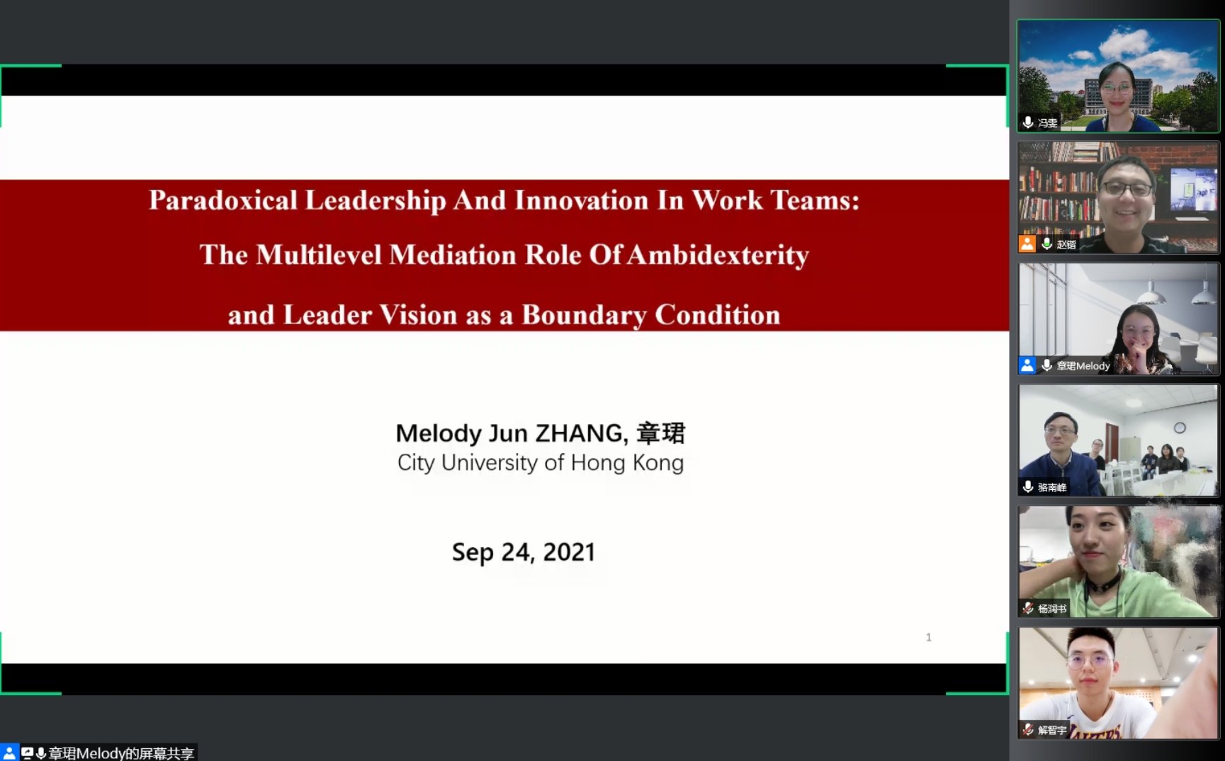 williamhill官网网站人力资源管理系2021年秋季学期半月谈学术论坛(第90期)于2021年9月24日(星期五)下午15:00至17:30采取线上腾讯会议的形式进行。来自香港城市大学商公司管理学系助理教授章珺老师分享了自己今年被Academy of Management Journal(《管理学会会刊》)接收的关于悖论型领导对个体及团队创新影响的研究论文。本次学术论坛由williamhill官网网站赵锴副教授主持,孙健敏教授、苏中兴教授、王桢教授、王丽娟副教授、王青副教授、骆南峰副教授、陈雯助理教授、李海蓉助理教授、冯雯助理教授,以及人力资源管理系近四十位博士生和硕士生参与了此次线上讲座和讨论。