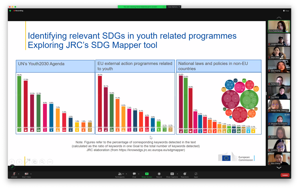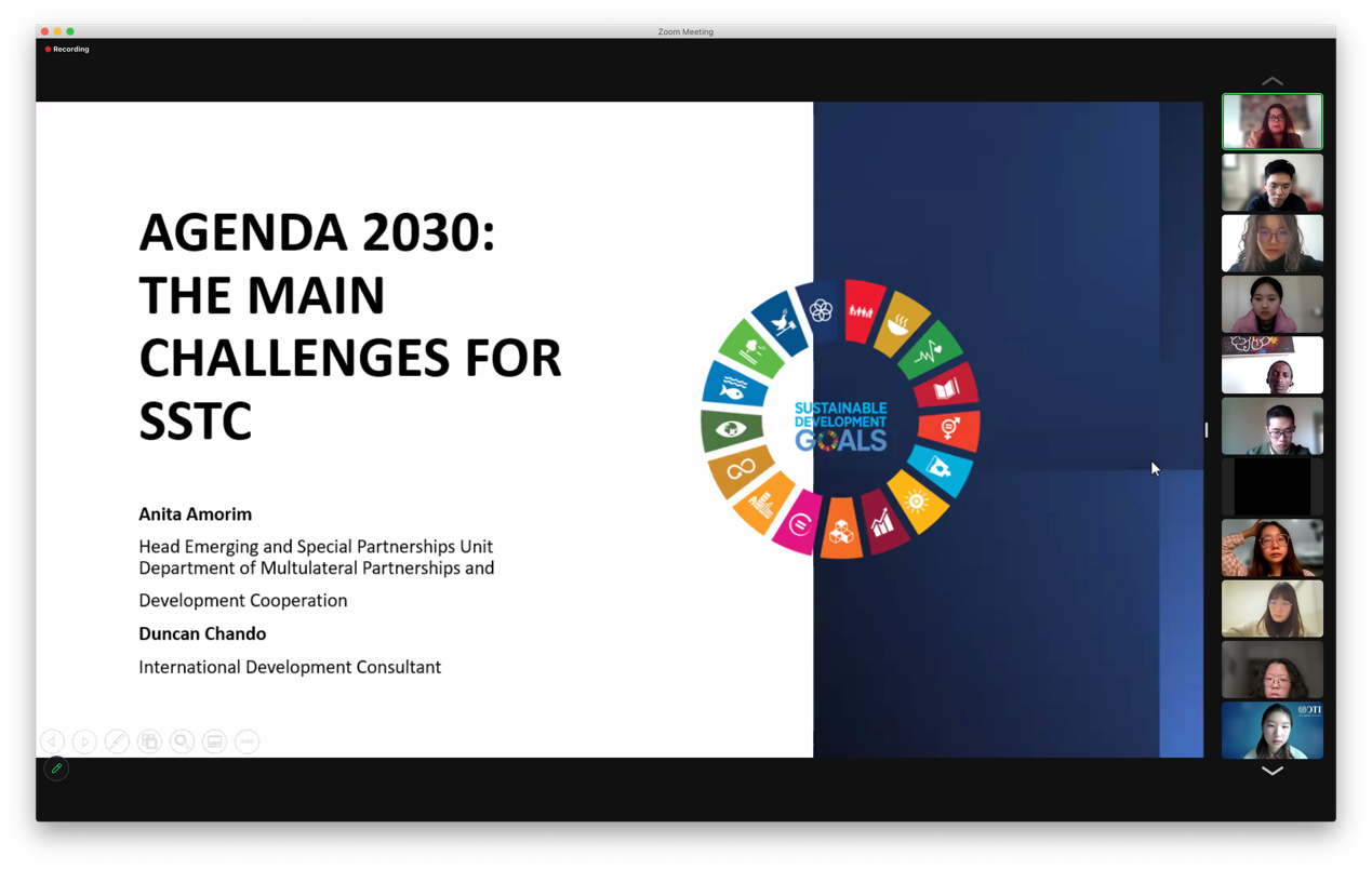 第一周的培训主题为“可持续发展议程、目标以及社会、经济和环境对其的包容性”。任职于联合国的Jan Vandemoortele博士与Tina Maria Saeteraas Stoum向同学们介绍了近十年来可持续发展目标取得的成就以及如何在国际情境下定位可持续发展的相关问题。来自日本教育部的Elizabeth Katherine Gamarra系统讲述了包容性社会下的教育体系。意大利驻联合国青年大使Giulia Tariello与Gabriele Colella简要概述了青年赋权的构想、实施方式与政策效果;Anita Amorim教授为同学们介绍了南南对话和多方合作(SSTC)的机制与案例研究。同学们积极讨论提问,互动问答,气氛热烈。