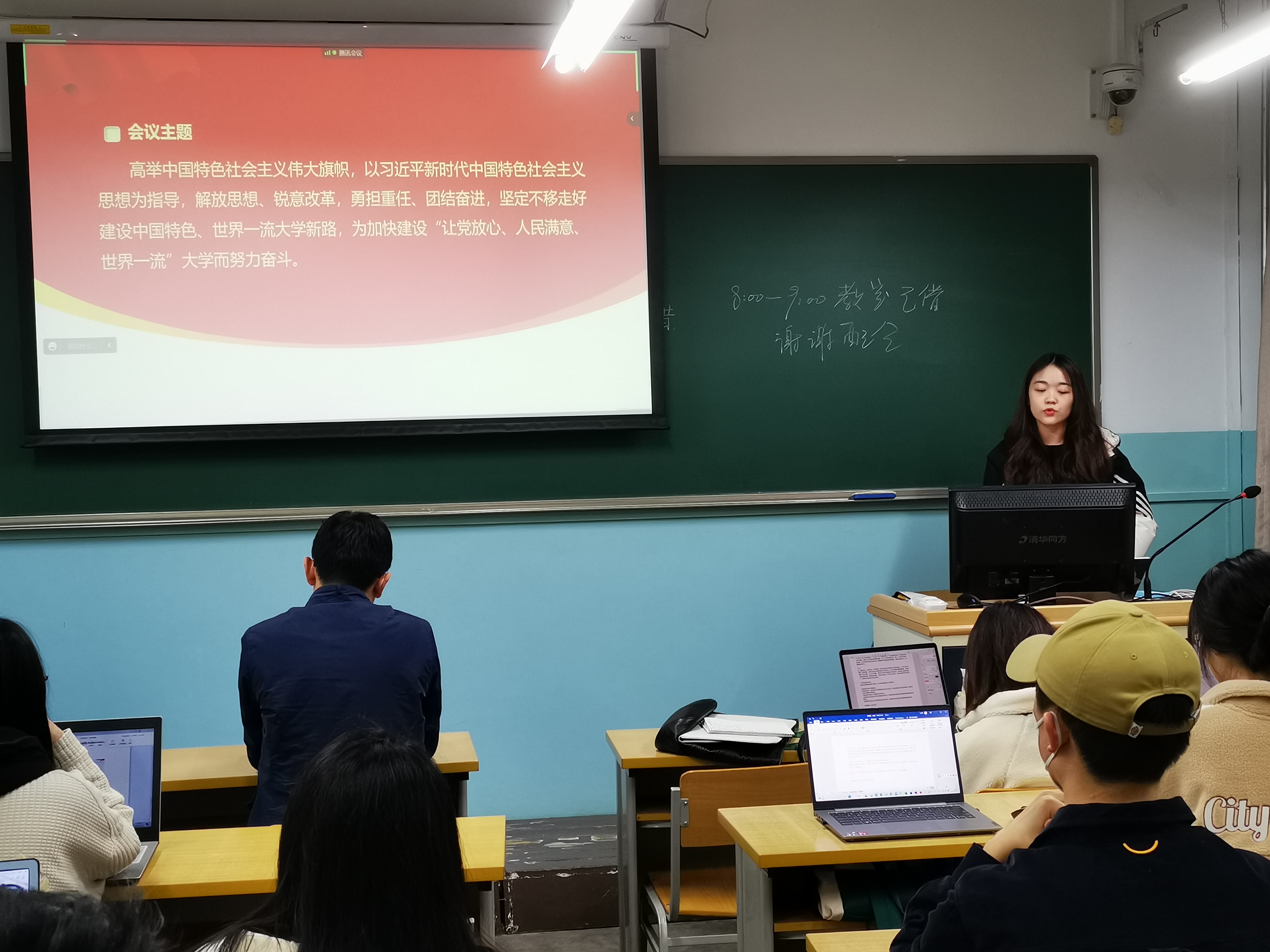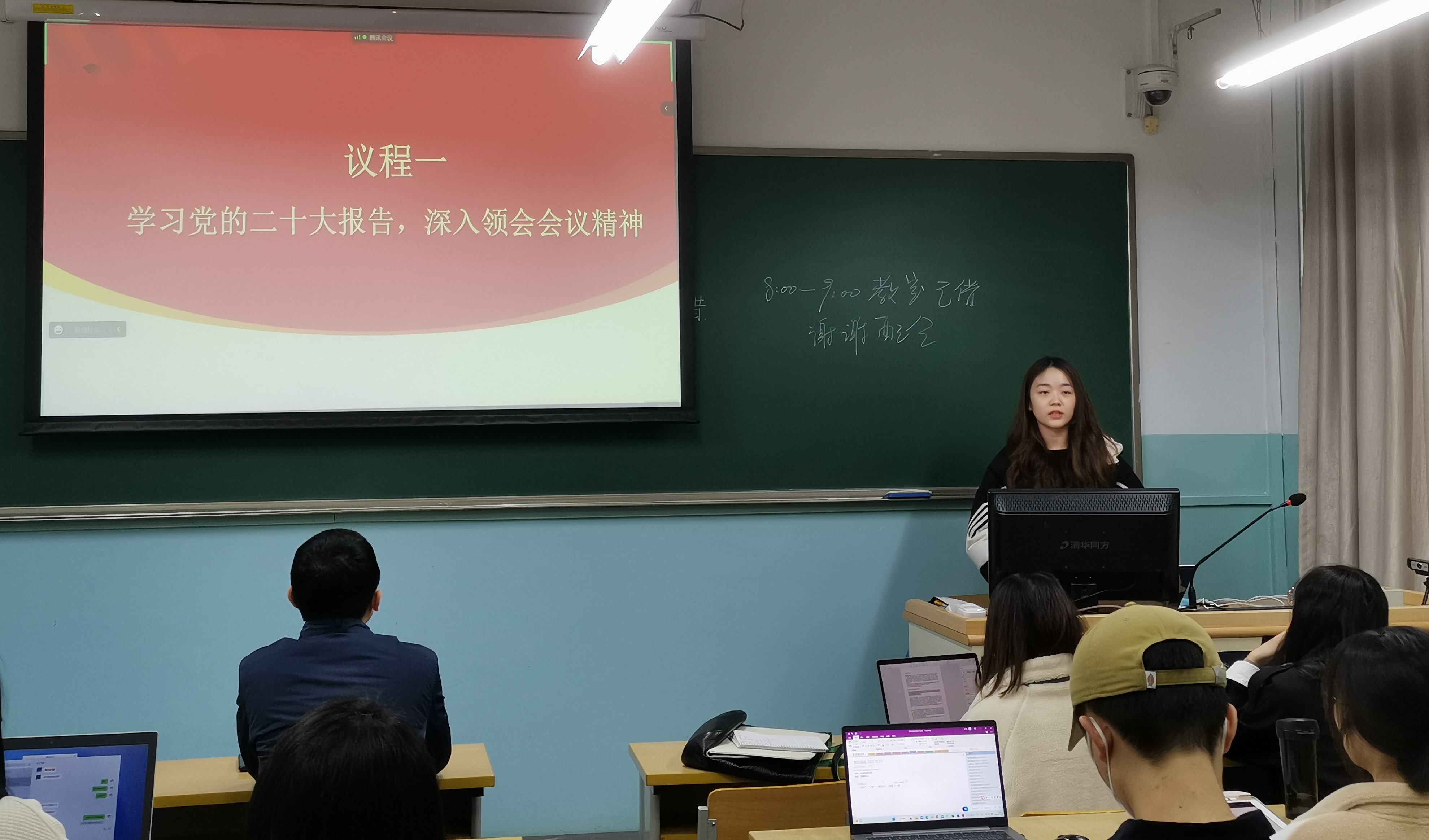 在会议的结尾,金铭指出,国家、社会、民族伟大的新征程已经开启,崭新的蓝图已然绘就,青春奋进正当时,号召支部同志迎着国家、社会和人民的期待,争做复兴栋梁、强国先锋。