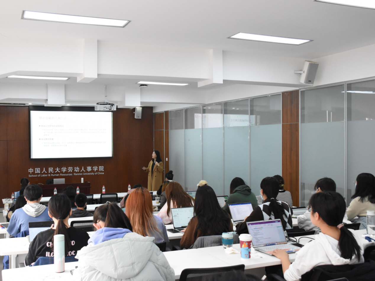 接下来,冯雯老师以“研究设计与学术写作”为主题,结合具体研究实例,为同学们进行了分享。首先,冯雯老师向同学们分享了学术作品选题方面的经验。她指出,进行主题筛选时,同学们需要关注时事热点,“面向世界科技前沿、面向经济主战场、面向国家重大需求、面向人民生命健康”,不要在“真空”中选择问题。此外,研究不是一味追求方法的复杂性,要注重与实践的结合。接着,冯雯老师向同学们介绍了研究设计的一般步骤。在进行研究设计时,首先应确定研究领域,每个研究领域背后都对应了一个特定的现象,选题无论是宽泛还是细致,都应该限定在所选的边界之内。在此基础上,进行文献综述,并阐述本研究该怎样解决该领域的现有问题。进一步地,再去论证如何选取特定的变量及理论视角来构建本文的理论模型,并进行假设推导及实证验证。最后,冯雯老师强调了学术规范重要性。所谓细节决定成败,一篇结构清晰、论述简洁明了的文章能够为评审人员留下良好的第一印象。