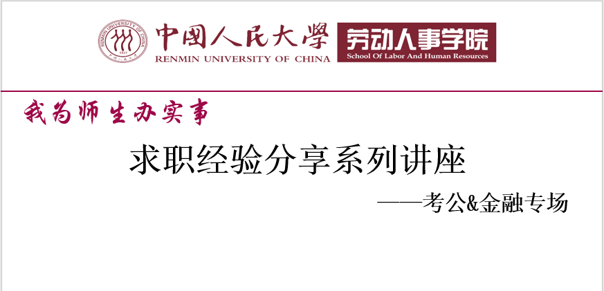 4月23日上午,第二场求职经验分享讲座——“考公&金融专场”也如期线上举行。此次讲座邀请了4位人大员工担任分享嘉宾,他们分别从公务员备考、工作经历分享、金融求职等方面分享了相关经验。