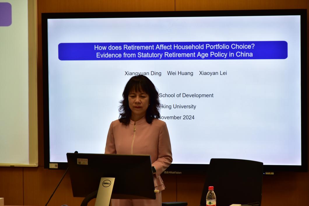 下午的主旨演讲由北京大学国家发展研究院经济学教授雷晓燕分享题为“How does Retirement Affect Household Portfolio Choice?: Evidence from Statutory Retirement Age Policy in China(退休如何影响家庭投资组合的选择?中国法定退休年龄政策的证据)”的研究。研究利用断点回归的方法,发现城镇男性到达退休年龄后,其家庭购买理财产品的概率以及金额均会上升,而持有流动性资产的数额会下降。机制分析发现,退休后收入水平、收入结构、时间利用、金融知识以及风险偏好的变化解释了上述结果的60%。