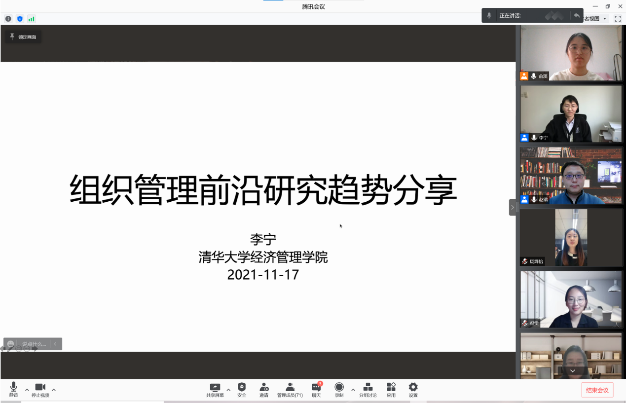 williamhill官网网站人力资源管理系2021年秋季学期半月谈学术论坛(第94期)于2021年11月17日(星期三)下午14:00至16:00借助腾讯会议的途径于线上顺利开展。来自清华大学经济管理公司领导力与组织管理系的李宁教授分享了关于组织管理研究领域最新发展趋势的看法,并探讨了如何在该领域进行高质量和有影响力研究的相关话题。本次学术论坛由williamhill官网网站赵锴副教授主持,孙健敏教授、周文霞教授、徐世勇教授、刘松博教授、李育辉教授、王桢教授、王青副教授、王丽娟副教授、骆南峰副教授、于坤副教授、陈雯助理教授、李海蓉助理教授、冯雯助理教授、陈力凡助理教授,以及近七十位博士生和硕士生参与了此次线上讲座和讨论。