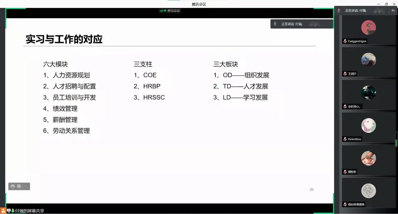 12月11日晚9点,“实习与升学”交流会之实习专场在公教二楼2106举办,交流会在腾讯会议平台同步直播。本科党支部书记、2021级人力资源管理专业硕士生付强参与交流会,从构建“世界观”、培养“胜任力”、运用“方法论”、做好“全方位”等四个方面介绍了人力资源管理类专业实习的工作内容和相关能力要求,分享了自己投递简历和面试的经验教训,为高年级本科生和硕士生实习提供经验借鉴。2019级本科生谭梦旎表示,经过本次交流,自己对实习有了相对准确的规划,不再因为身边的同学纷纷实习而焦虑,也了解了实习工作中需要的必备技能,可以有针对性地进行准备。