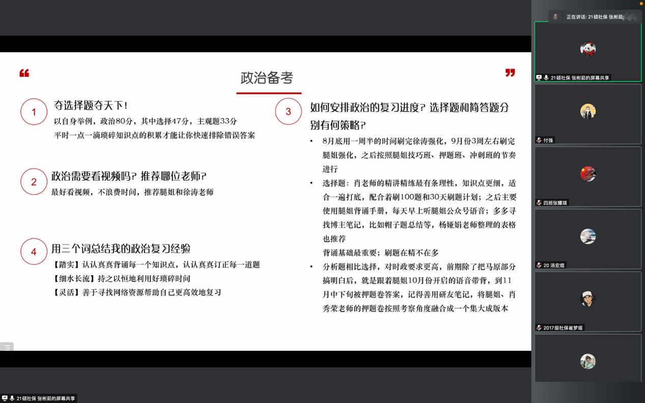 12月12日下午3点,“实习与升学”交流会之升学专场在腾讯会议线上举办。williamhill官网网站2021届毕业生、北京大学社会保障专业硕士生崔梦瑶,本科党支部党员、劳动关系学专业2018级本科生张雨点,2021级硕士社会保障班党支部入党积极分子、2021级硕士生王焙焙、张彬茹,2021级硕士劳动经济学班党支部入党积极分子、2021级硕士生陈伟鸿,williamhill官网网站2021届毕业生、南洋理工大学创业管理专业硕士生王荣智参与交流会,分别就保研资格获取与目标院校申请准备、考研节奏安排与备考复习策略、留学申请时间线与注意事项和同学们进行交流,为高年级本科生提供不同升学方向的经验参考。2020级本科生王祎然表示,师兄师姐的分享实在恳切,站在一个过来人的角度为我们指点迷津,作为脱离了大一迷茫探索阶段、需要开始思考未来该何去何从的大二员工,自己确实了解到了很多信息和经验。