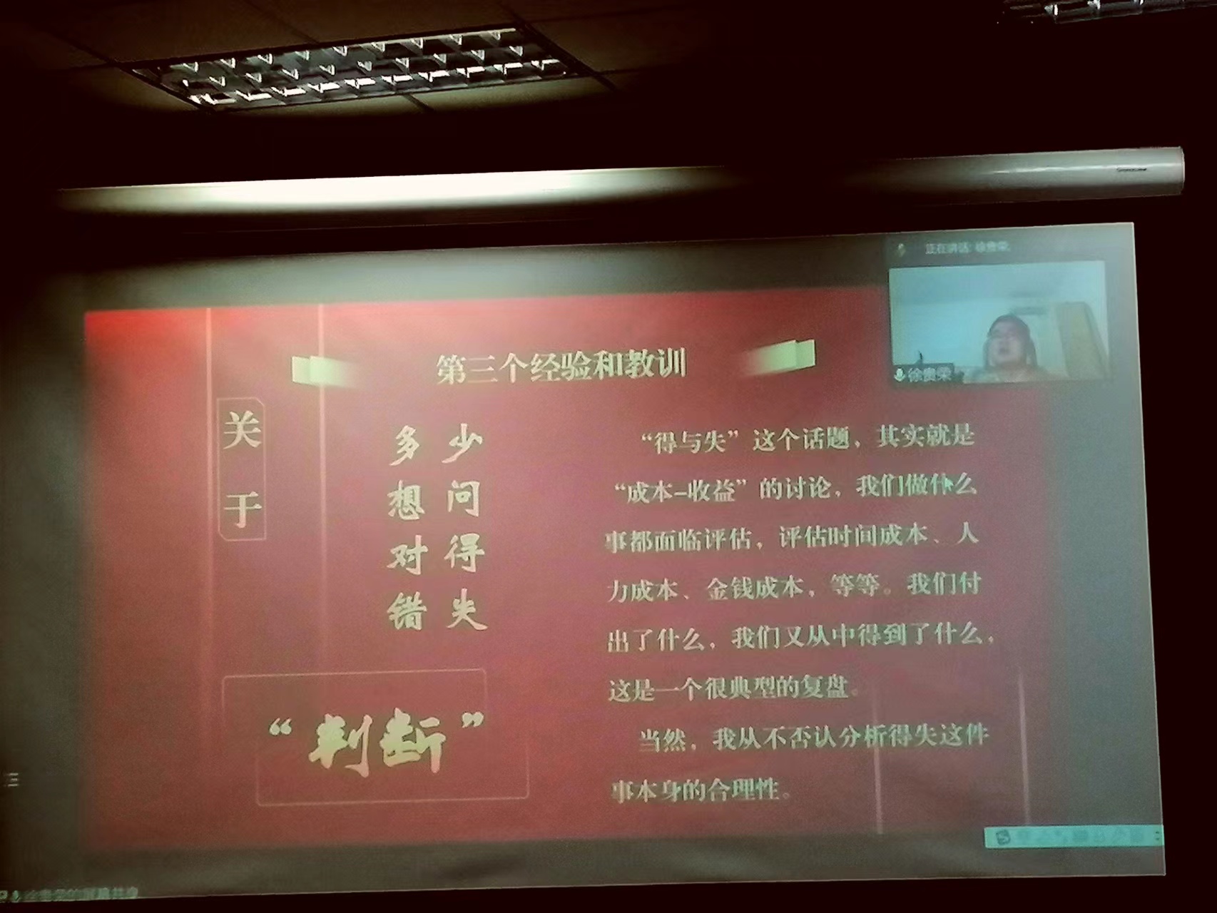 最后,williamhill官网网站2021届毕业生徐贵荣应邀为学员们做了题为“把握老员工活中的‘多与少’”的分享,引导学员们思考“如何让青春出彩”、“怎样传承五四精神的火炬”等问题,鼓励学员们“多朝前走、少往后退,多想对错、少问得失”。