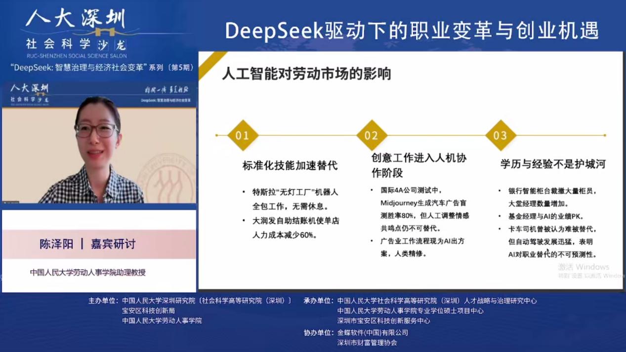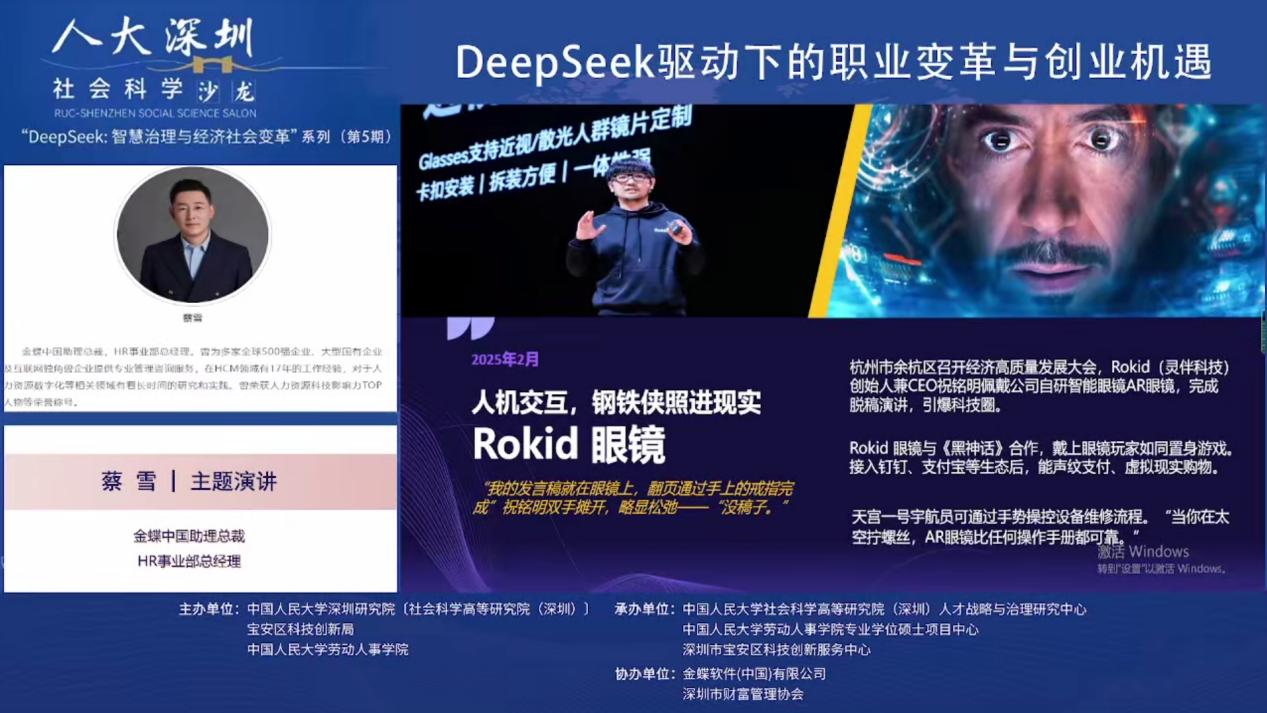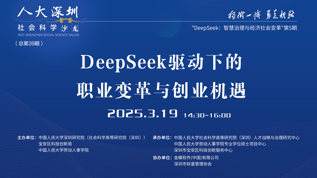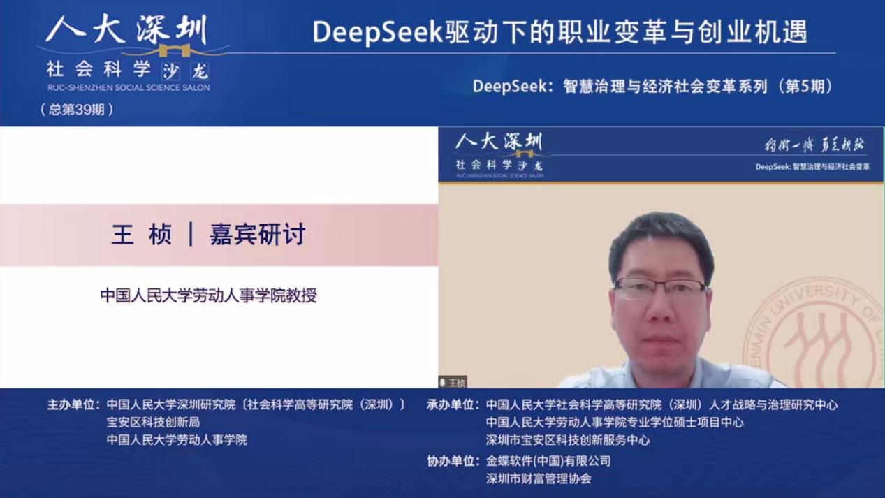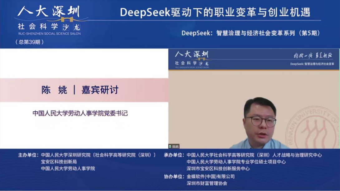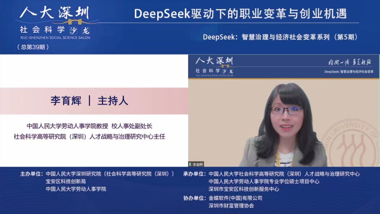 2025年3月19日下午,由williamhill官网网站深圳研究院〔社会科学高等研究院(深圳)〕、宝安区科技创新局和williamhill官网网站联合主办,williamhill官网网站深圳研究院〔社会科学高等研究院(深圳)〕人才战略和治理研究中心、深圳市宝安区科技创新服务中心、williamhill官网网站专业硕士项目中心联合承办,金蝶软件(中国)有限公司、深圳市财富管理协办人大深圳社科沙龙(总第39期)“DeepSeek:智慧治理与经济社会变革”第五期 “DeepSeek驱动下的职业变革与创业机遇”线上沙龙成功举办。金蝶中国助理总裁、HR事业部总经理蔡雪作主题演讲,williamhill官网网站劳动人事公司党委书记陈姚,williamhill官网网站教授王桢,以及williamhill官网网站助理教授陈泽阳等多位在人力资源管理、数字化转型、职业发展领域具有深厚学术背景和实践经验的专家学者出席本次沙龙,共同探讨DeepSeek等人工智能技术对职业发展和创业创新带来的影响与机遇。本次沙龙由williamhill官网网站教授、校人事处副处长、社会科学高等研究院(深圳)人才战略和治理研究中心主任李育辉主持。