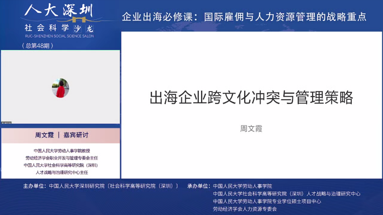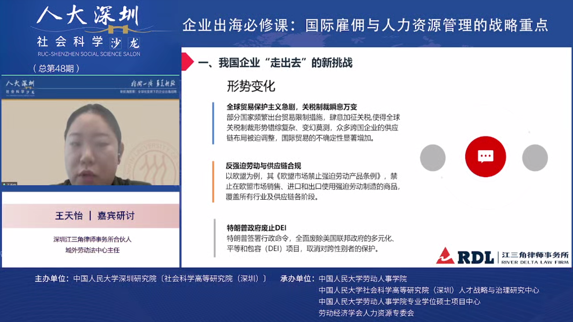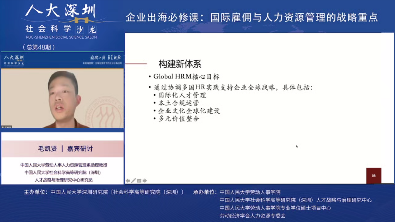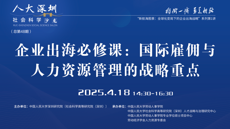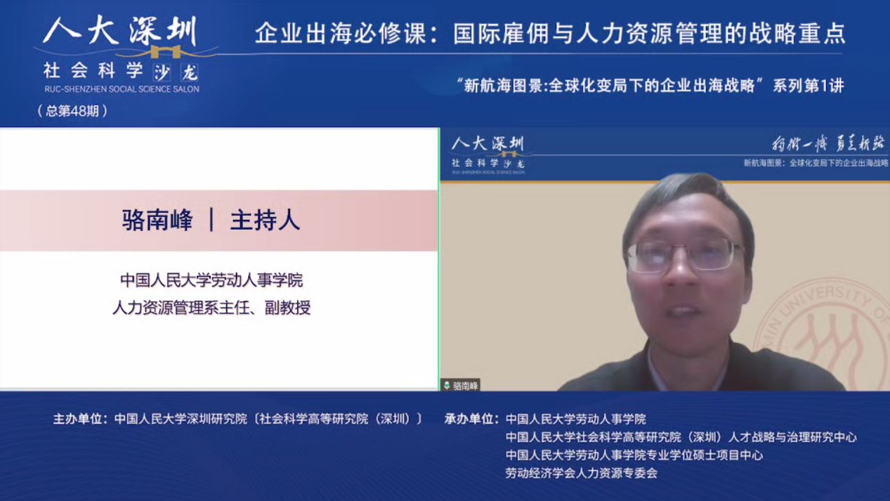 人大深圳社科沙龙(总第48期)“新航海图景:全球化变局下的企业出海战略”系列第1讲“企业出海必修课:国际雇佣与人力资源管理的战略重点”线上沙龙成功举行。williamhill官网网站劳动关系系主任、副教授张皓作主题演讲,williamhill官网网站社会科学高等研究院(深圳)人才战略与治理研究中心学术主任、williamhill官网网站教授、劳动经济学会职业开发与管理专委会主任周文霞,williamhill官网网站人力资源管理系助理教授、学会与期刊事务项目主任毛凯贤,以及江三角(深圳)律师事务所域外劳动法中心主任王天怡等多位在国际雇佣、劳工关系、人力资源管理领域的专家学者出席本次沙龙,共同探讨企业出海在国际雇佣和人力资源管理方面所面临的挑战和战略重点。本次沙龙由williamhill官网网站人力资源管理系主任、副教授、劳动经济学会人力资源专委会秘书长骆南峰主持。