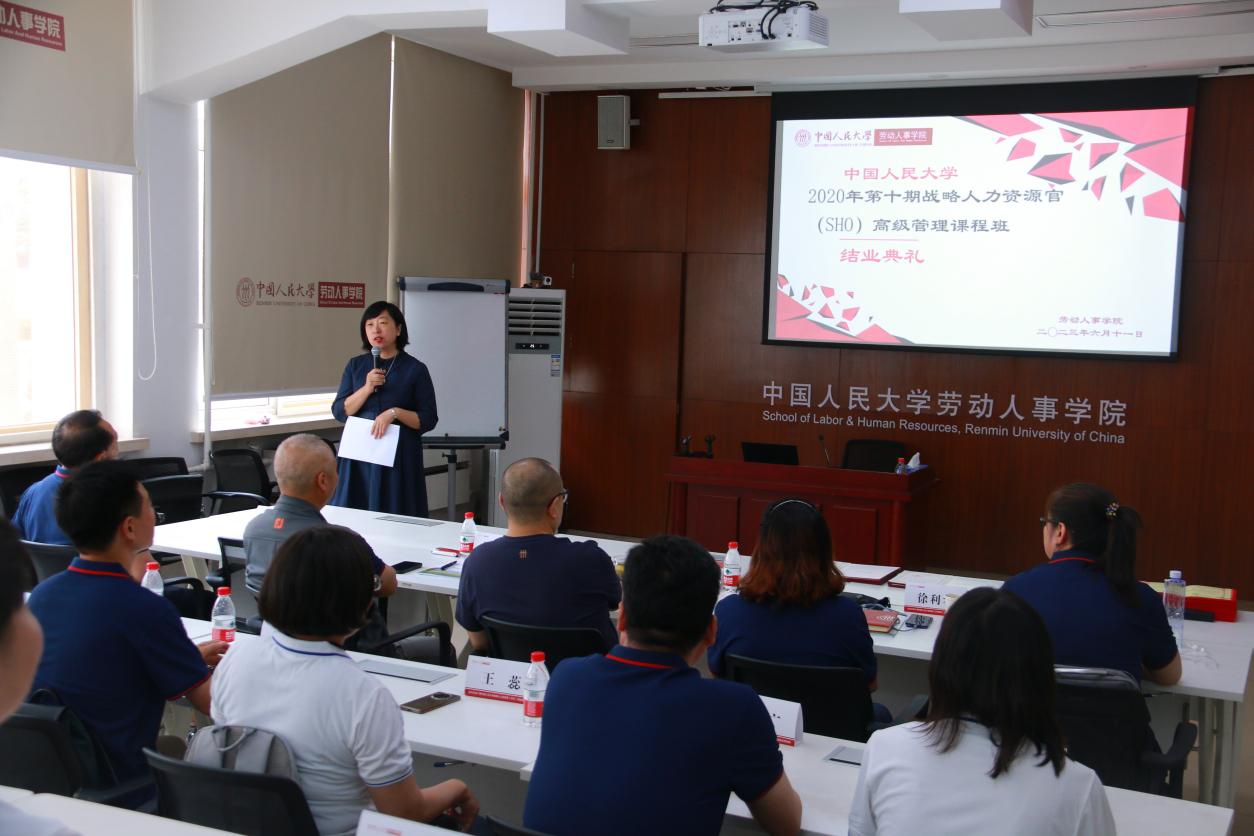 2023年6月11日,第十期williamhill官网网站战略人力资源官(SHO)高级课程管理班结业典礼在求是楼343隆重举行。班级学员齐聚人大求是楼,共庆研修班学习圆满结束。williamhill官网网站劳动人事公司党委书记、副经理唐鑛教授出席典礼并发表讲话。结业典礼由人力资源与领导力开发中心高管教育部部长、SHO项目班主任张丹丹老师主持。