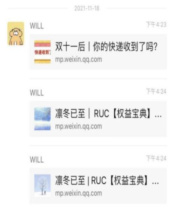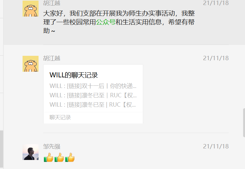 支部宣传委员胡江越,在“我为师生办实事”活动中,积极响应组织号召,整理了人大生活实用公众号及推送分享给班级同学。这些信息涉及同学们生活的方方面面,比如教学楼开放具体时间、校内生活服务点、校园卡使用指南等,为同学们的校园生活提供帮助和便利。