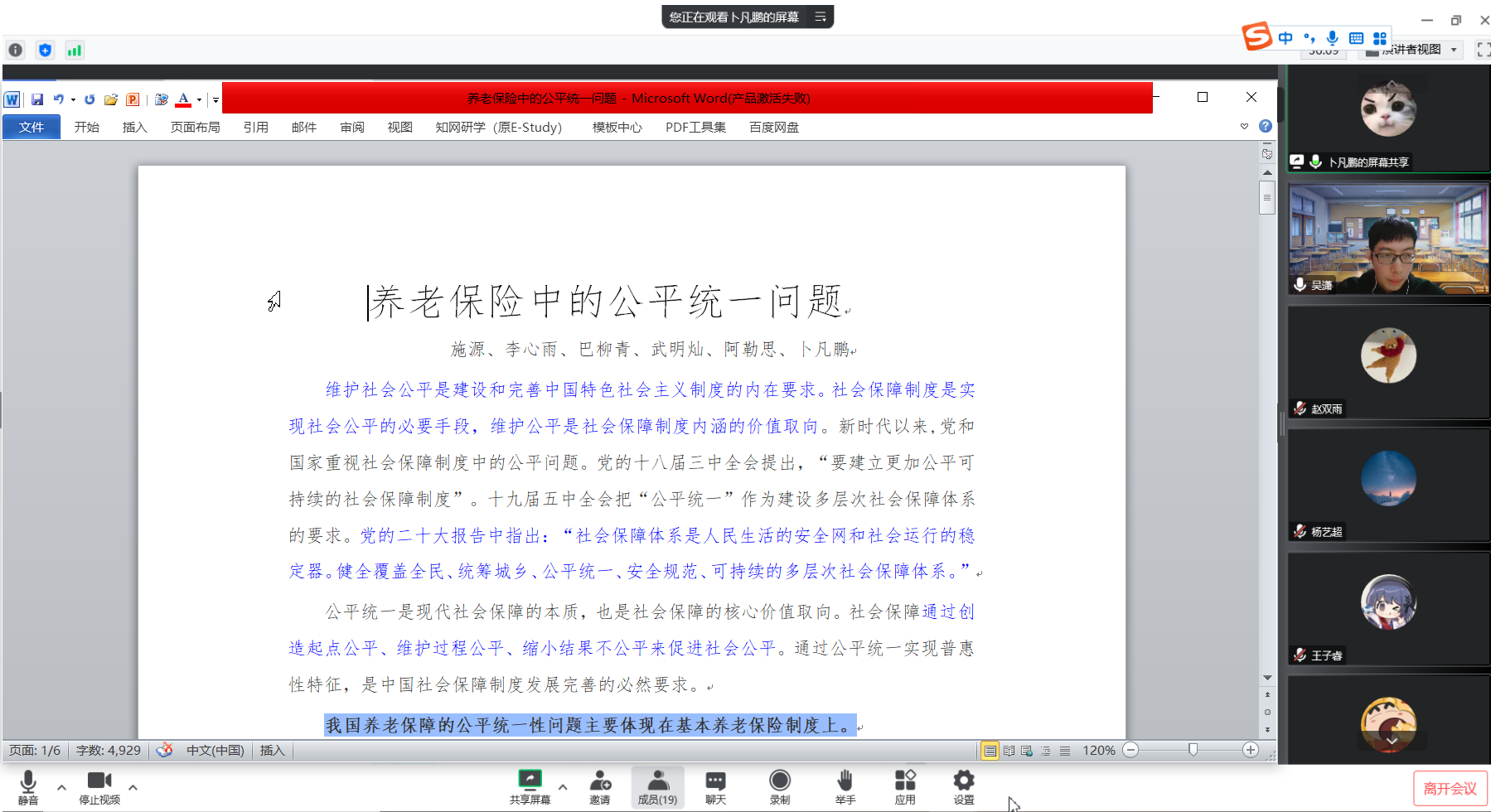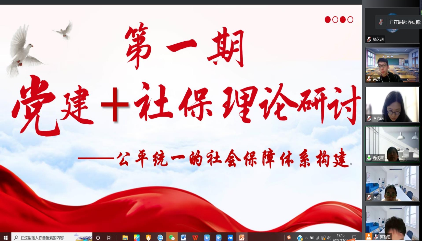 为了贯彻落实党的二十大精神及习近平总书记在考察williamhill官网网站时重要讲话精神,时刻做到“坚持问题导向”、“增强问题意识”“不断研究新情况,总结新经验,解决新问题”,2022级硕士社会保障班党支部于12月14日晚在线上顺利举办第一期“党建+社保理论研讨”活动。本次研讨以公平统一的社会保障体系构建为主题,分析我国社会保障公平统一问题的现状、成因及对策,旨在通过研讨党和人民关切的社会保障问题,提升支部的党性修养与专业素养,强化支部建设,筑牢坚强战斗堡垒。活动由支部书记吴潇主持,williamhill官网网站副教授、2022级硕士社会保障班主任乔庆梅受邀参与研讨。
