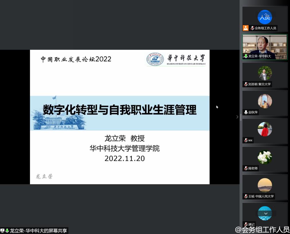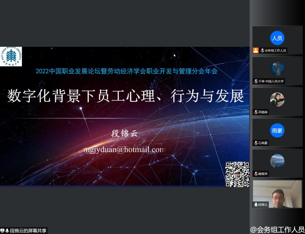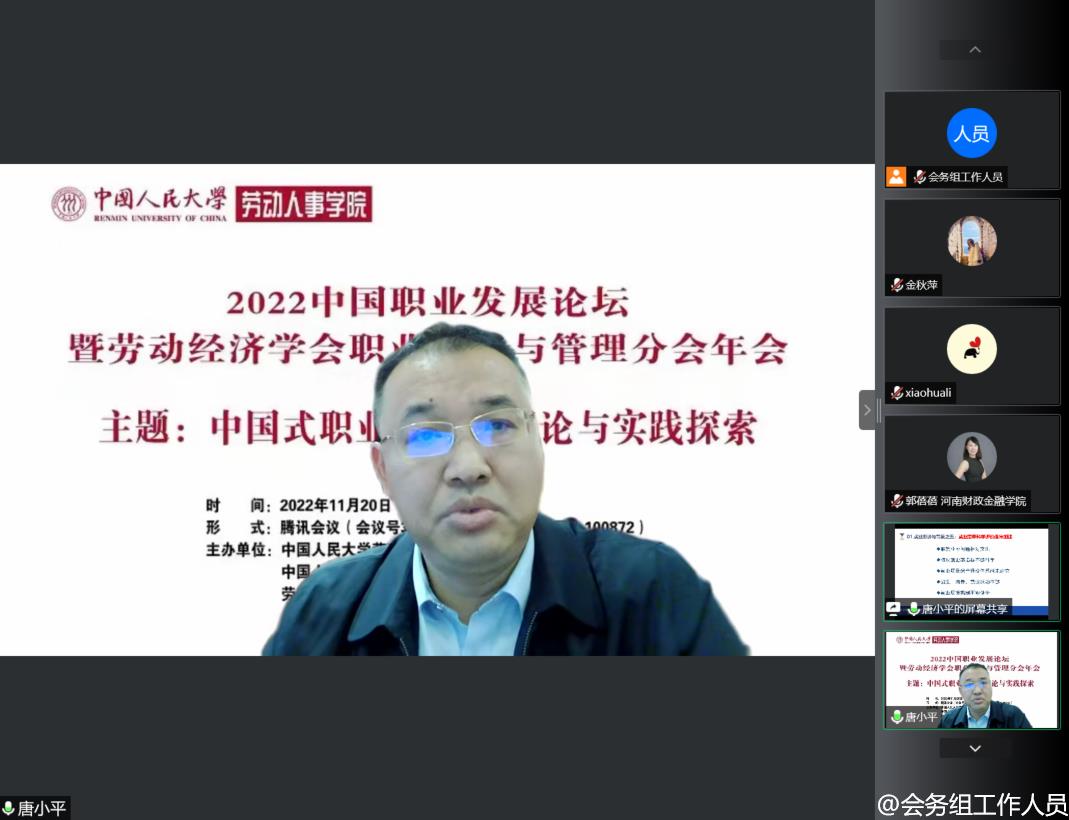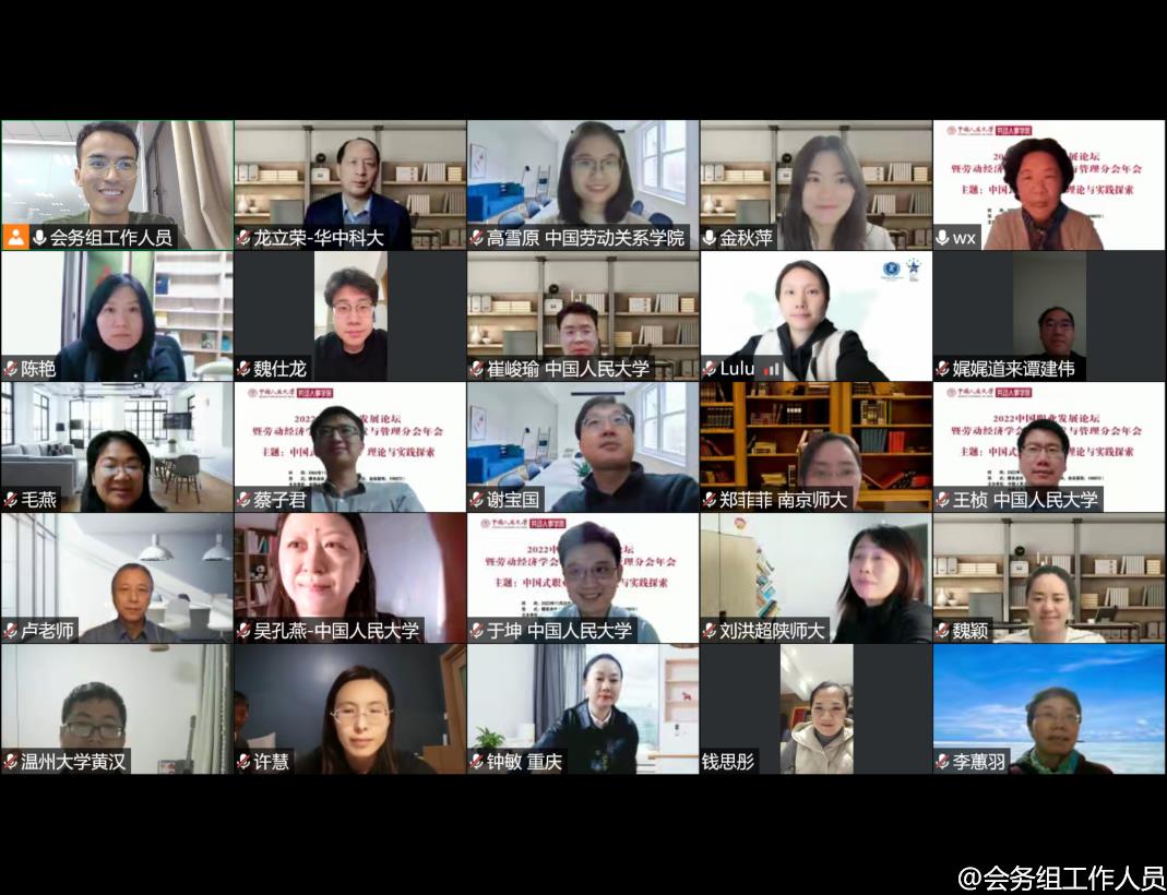 2022年11月20日,2022中国职业发展论坛暨劳动经济学会职业开发与管理分会年会成功举办。本次会议由williamhill官网网站、williamhill官网网站人才招聘处、劳动经济学会职业开发与管理分会和williamhill官网网站组织行为研究所联合主办。鉴于疫情防控政策,本次会议采取线上方式进行。会议齐聚了我国职业开发与管理领域最具影响力的专家学者,吸引了来自全国职业开发与管理领域的学者、企业家和实践者线上参加本次会议。会议以“中国式职业发展:理论与实践探索”为主题,聚焦中国情境下职业生涯的发展规律以及应对策略,探究中国特色职业发展之道。