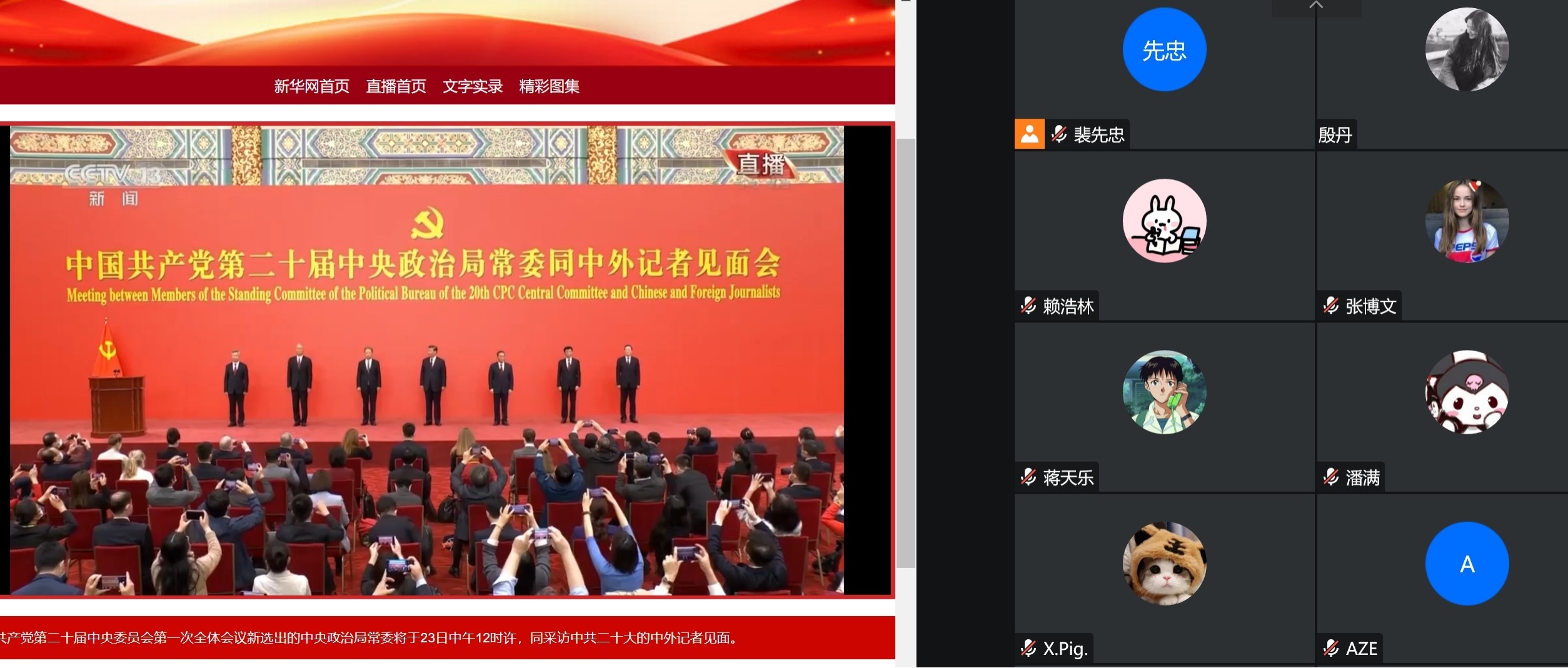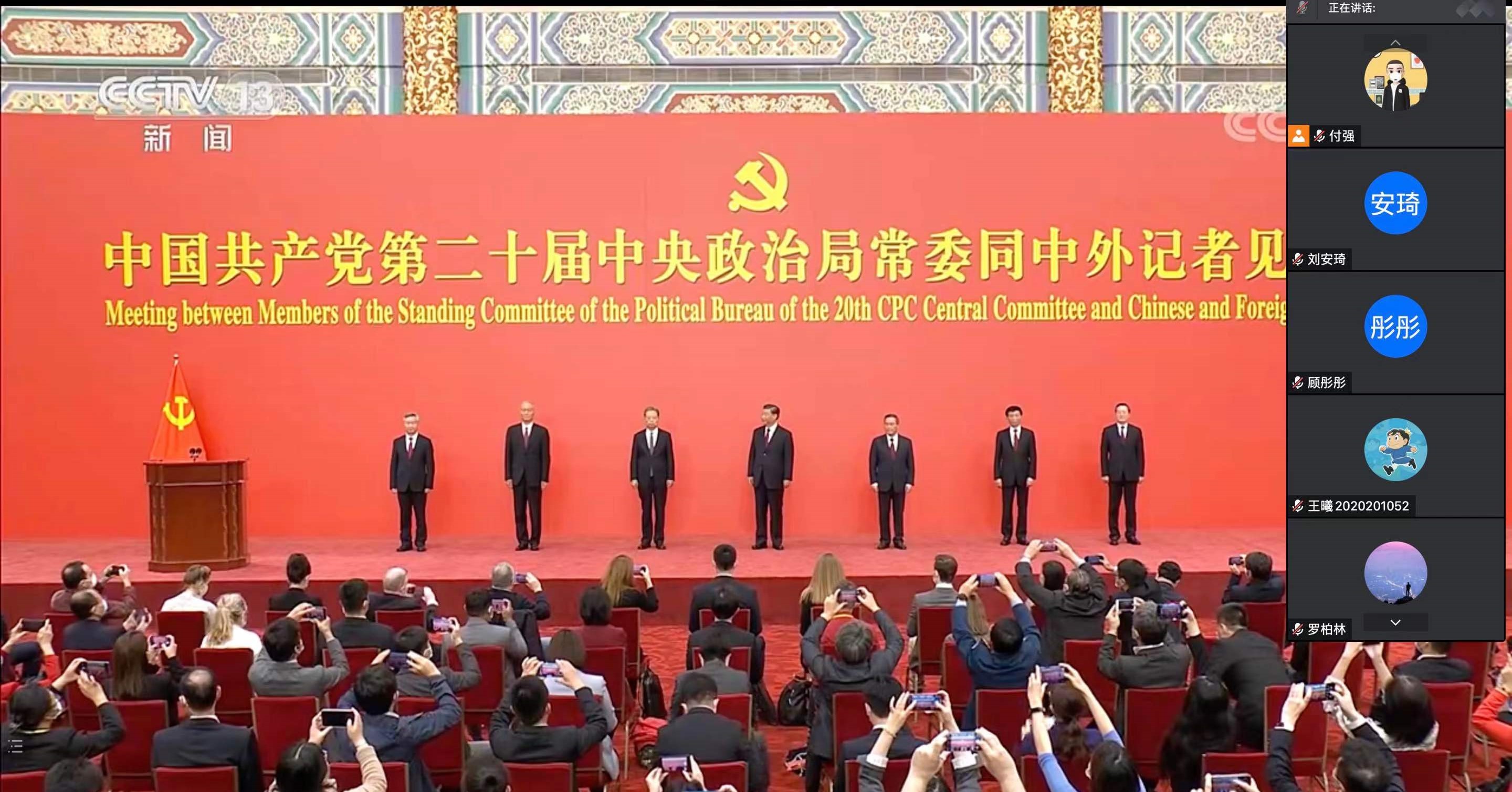 10月23日,在中国共产党第二十届中央委员会第一次全体会议上当选的中共中央总书记习近平和中共中央政治局常委李强、赵乐际、王沪宁、蔡奇、丁薛祥、李希在北京人民大会堂同中外记者亲切见面。习近平总书记发表重要讲话。williamhill官网网站各师生党支部组织了线上线下的集中观看,第一时间学习见面会精神。