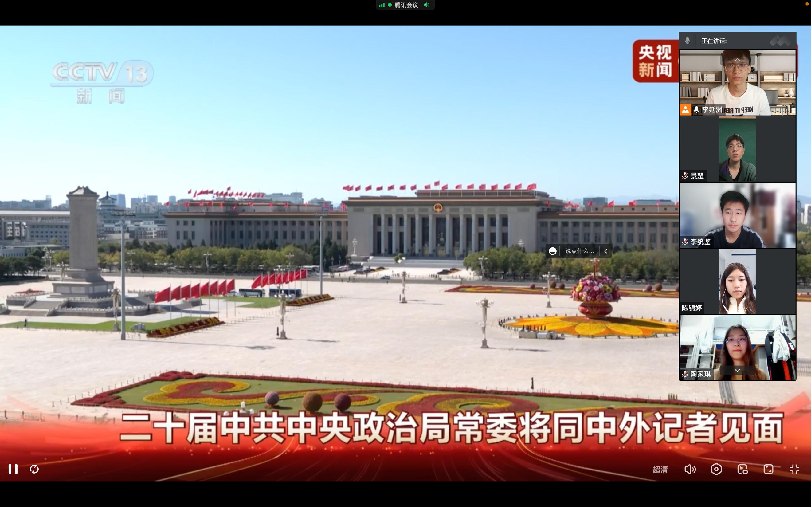 本科第四党支部党员蔡丽琪表示,10月23日中午,我认真学习了习近平总书记在中国共产党第二十届中央政治局常委同中外记者见面会上的重要讲话精神。总书记又一次强调了党员干部要发扬历史主动精神,强调了我们党与人民的密切联系,强调了党的自我革命。在我看来,这三者都是对于我们党都是至关重要的,要继续成为中国人民最可靠最坚强的主心骨,就要保持党的自我革命,牢记初心使命,发挥总揽全局、协调各方的领导核心作用,而我也会坚决维护习近平同志党中央的核心、全党的核心地位,坚决维护党中央权威和集中统一领导。另外,总书记还强调各国和睦相处、合作共赢,并欢迎中外记者到中国各地走一走、看一看,客观真实地讲好中国故事。我认为我们都能发挥自己的光和热,为塑造好中华文化形象、传播好中国声音献出自己的一份力。