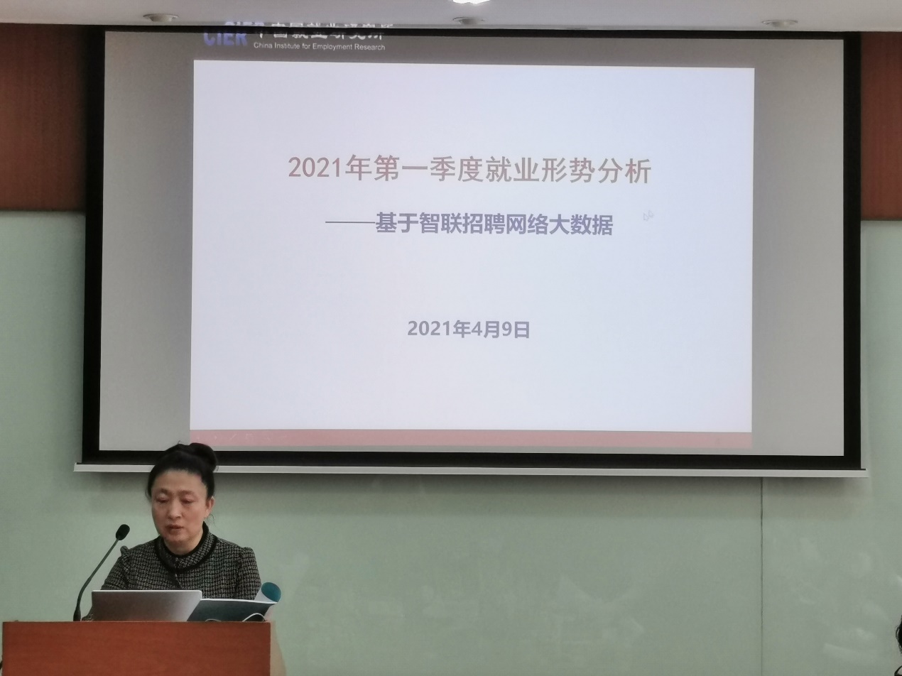 在主题报告阶段,耿林研究员作了题为《2021年第一季度就业形势分析——基于智联招聘网络大数据》的主题报告。报告首先对2021年第一季度的就业市场总体情况进行介绍,随后进一步就不同行业及职业、不同行政区域及不同等级城市、不同企业规模和不同企业性质的就业景气程度进行了深入分析。报告指出,2021年第一季度就业景气指数(CIER指数)的季度指标由上季度的1.95下降至1.66,但比去年同期上升0.23。从CIER指数的月度指标来看,2021年1月份需求同比增加2.63%,供给同比增加14.97%,1月份CIER指数同比下降0.27;2月份需求同比大幅度上升24.39%,而供给同比上升12.03%,2月CIER指数同比上升0.16;3月份需求同比上升22.6%,但供给同比下降12.16%,CIER指数同比上升0.40。综合三个月来看,一季度CIER指数同比上升,环比下降。
