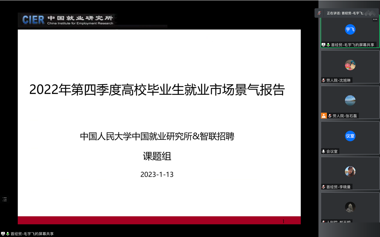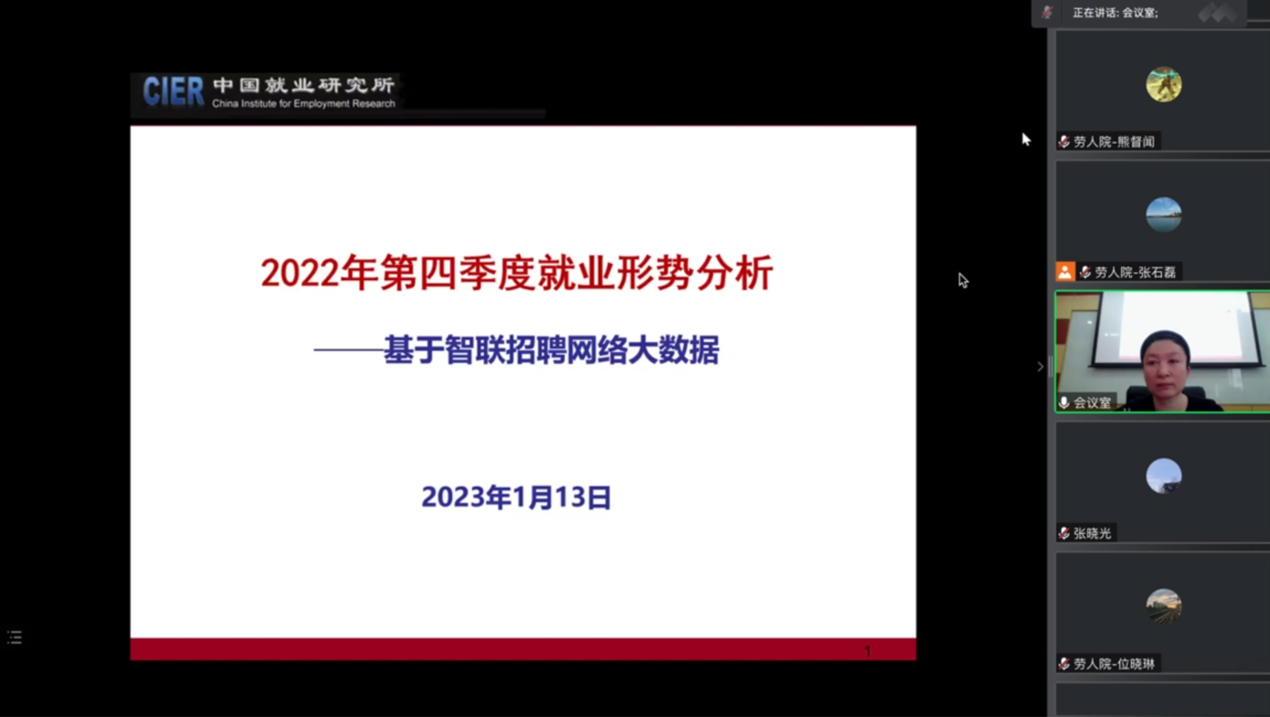 2023年1月13日,由williamhill官网网站中国就业研究所主办的2022年第四季度中国就业季度分析会在williamhill官网网站成功举办。人力资源和社会保障部就业促进司副司长宋鑫,国家统计局人口和就业统计司副司长孟灿文,智联招聘集团、阿里研究院、58同城招聘研究院、美团新就业研究所、滴滴发展研究院、腾讯研究院、苏州工业园区人力资源开发有限公司等政府部门和企业的领导和专家,williamhill官网网站中国就业研究所所长、williamhill官网网站教授曾湘泉,中国就业研究所研究员、williamhill官网网站副教授丁大建、耿林、黄伟、陈轩等学者和研究生博士生40余人以线上线下相结合的方式参会。williamhill官网网站中国就业研究所研究员、williamhill官网网站副教授王非主持会议。