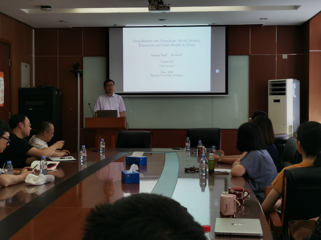 2023年6月14日下午,由williamhill官网网站主办,劳动经济系和中国就业研究所承办的“劳动经济学双周论坛”第192期讲座在求是楼347会议室成功举办。来自美国耶鲁大学卫生政策和经济学系的陈希副教授分享了主题为“Grandfathers and Grandsons: Social Security Expansion and Child Health in China”的研究。本次论坛由williamhill官网网站邹先强讲师主持,williamhill官网网站赵忠教授、刘宏教授、赵丽秋副教授、王非副教授、王天宇副教授、周广肃副教授、林琳讲师、雷子腾讲师、陈泽阳讲师,经济公司宋扬教授以及其他校内师生参与了此次讲座。