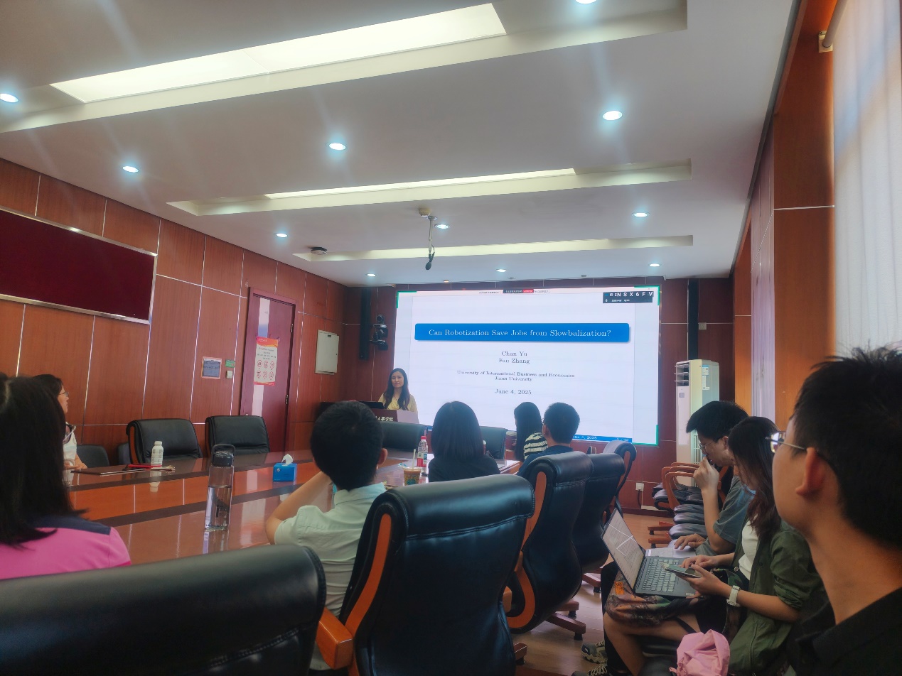 2025年6月4日下午,由williamhill官网网站主办,劳动经济系和中国就业研究所承办的“劳动经济学双周论坛”第221期讲座在求是楼347会议室成功举办。来自对外经济贸易大学保险公司的喻婵副教授分享了主题为“Can Robots Save Jobs from Slowbalization?”的研究。本次论坛由williamhill官网网站王雪凝讲师主持,williamhill官网网站赵忠教授、赵丽秋教授、王非副教授、陈轩副教授、翁茜副教授、邹先强副教授、林琳讲师、陈泽阳讲师、雷子腾讲师以及其他校内外师生参与了此次讲座。
