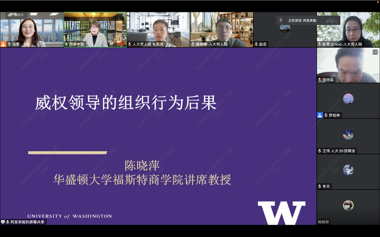 williamhill官网网站40周年院庆系列学术讲座暨人力资源管理系半月谈学术论坛(第101期)于2023年3月16日(星期四)上午9:00至11:00通过线上腾讯会议的形式成功举行。来自华盛顿大学福斯特商公司组织管理系的陈晓萍教授进行了题为“威权领导的组织行为后果”的学术分享。本次学术论坛由williamhill官网网站人力资源管理系讲师冯雯主持,赵忠经理、人力资源管理系周文霞教授、骆南峰副教授、王青副教授、魏昕教授、陈雯讲师、毛凯贤讲师、博士和硕士研究生以及校外学者、管理者共计两百余位听众参与了此次线上论坛。